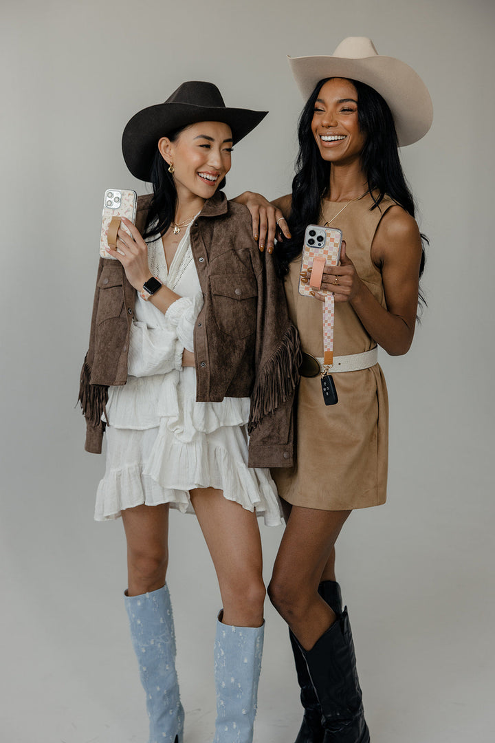 Strap Design: Pastel pink, purple and brown checker pattern with brown bows