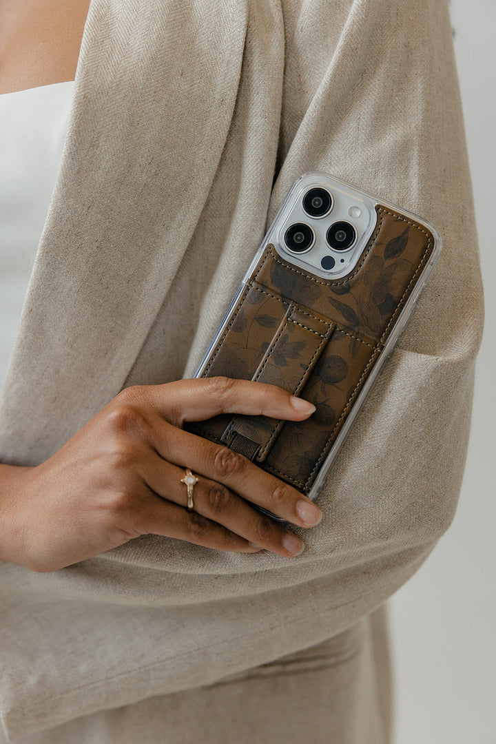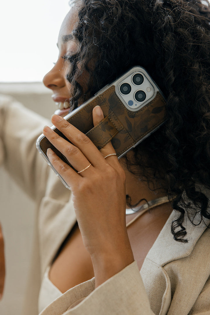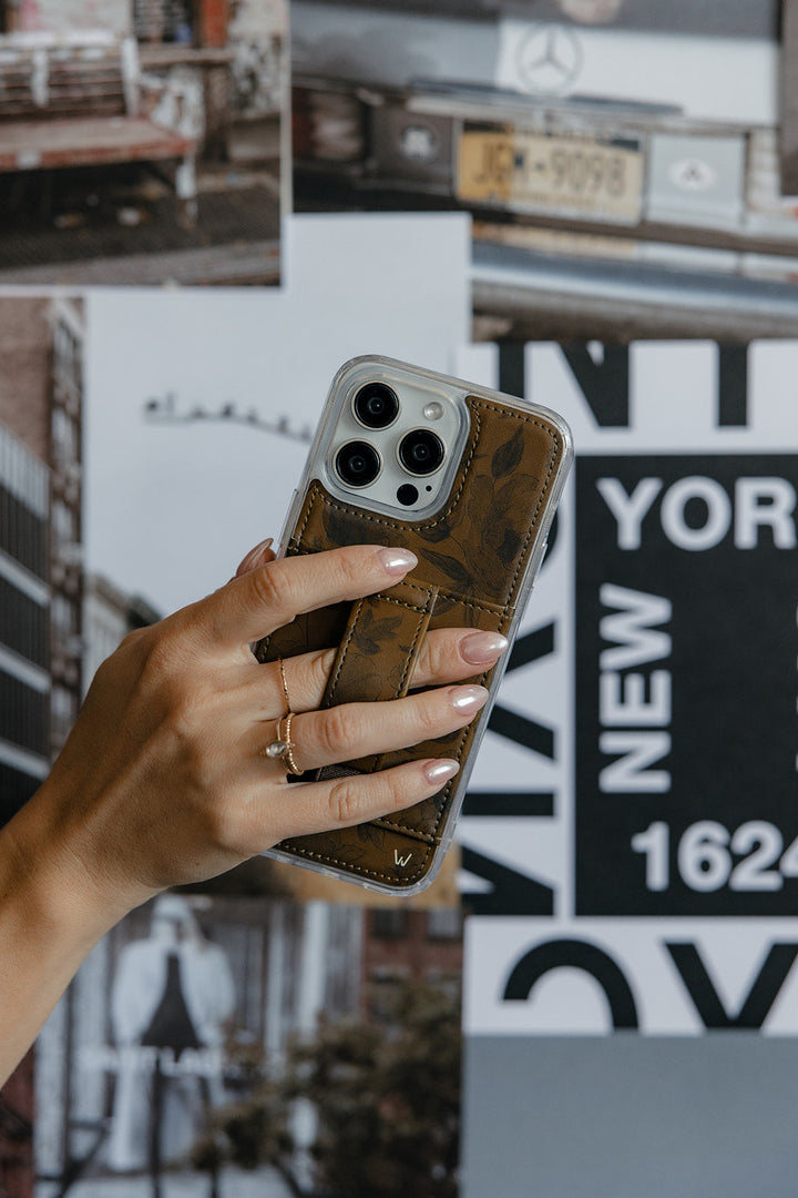 Case Design: Black watercolor flowers on a brown background