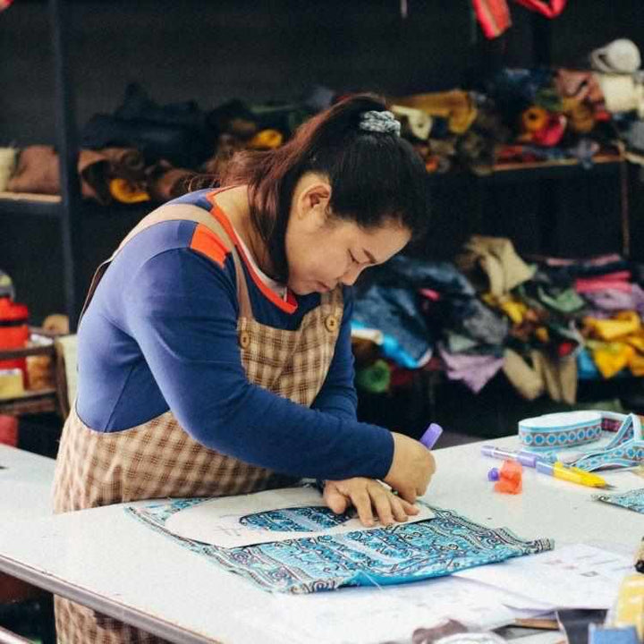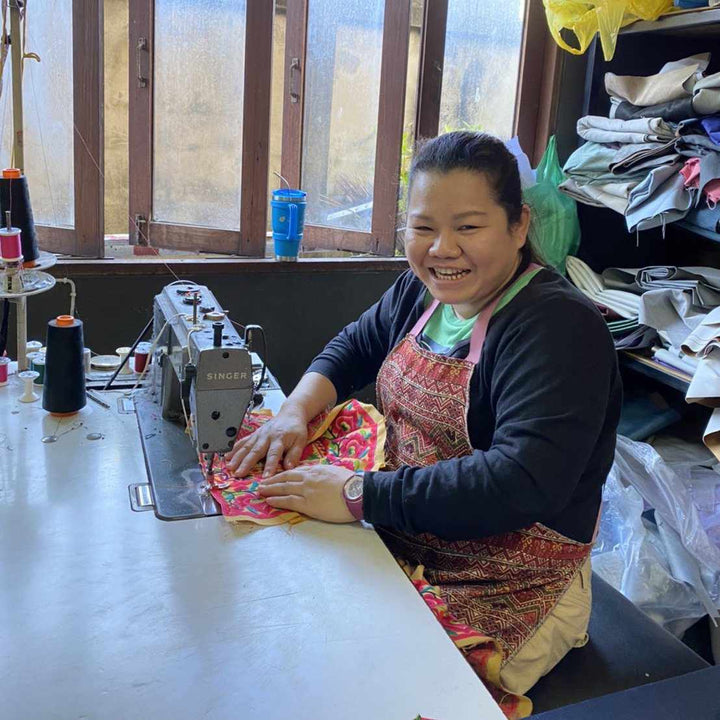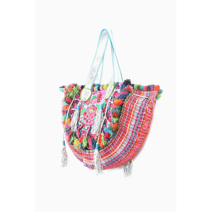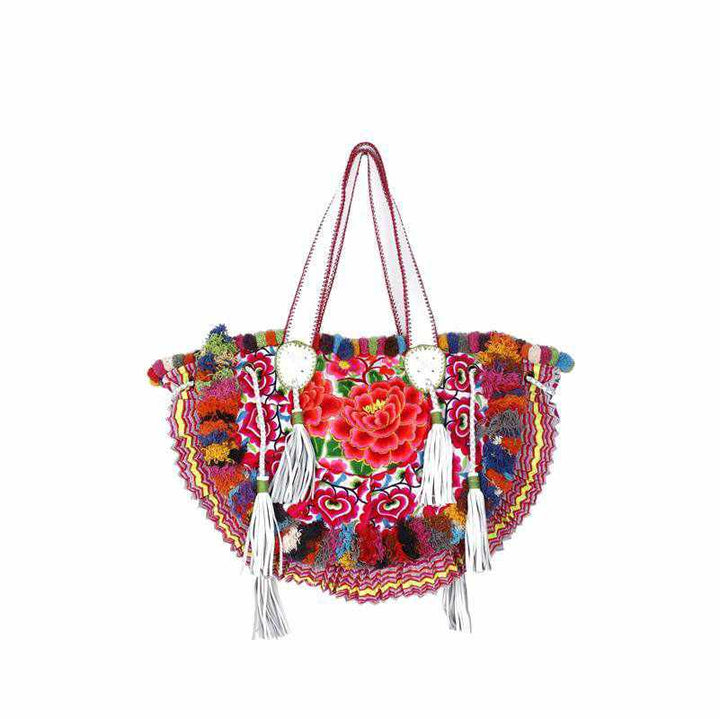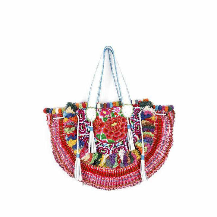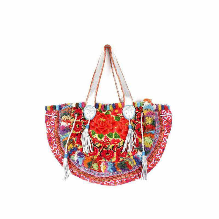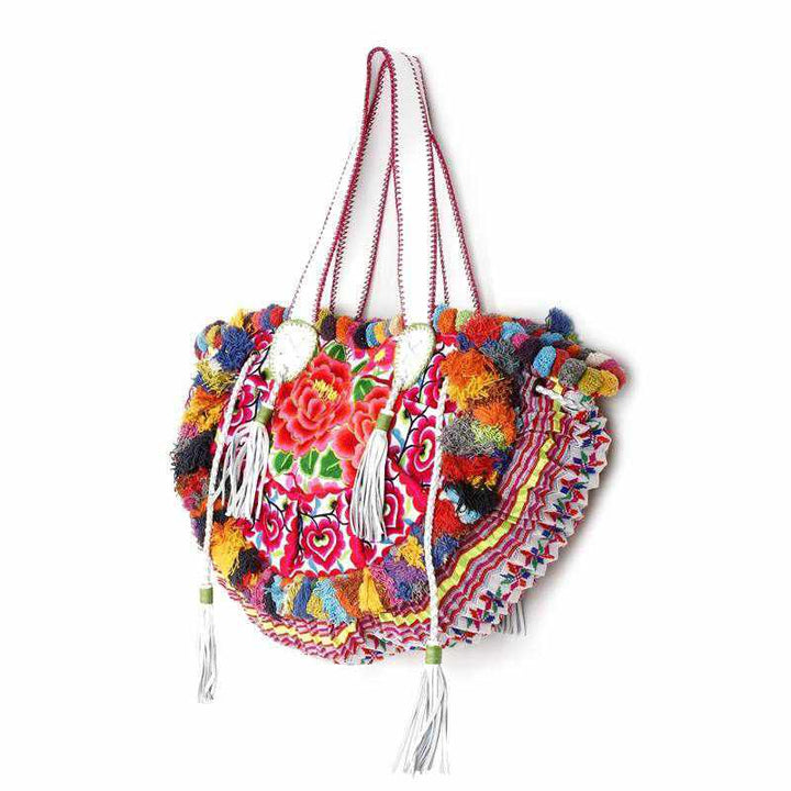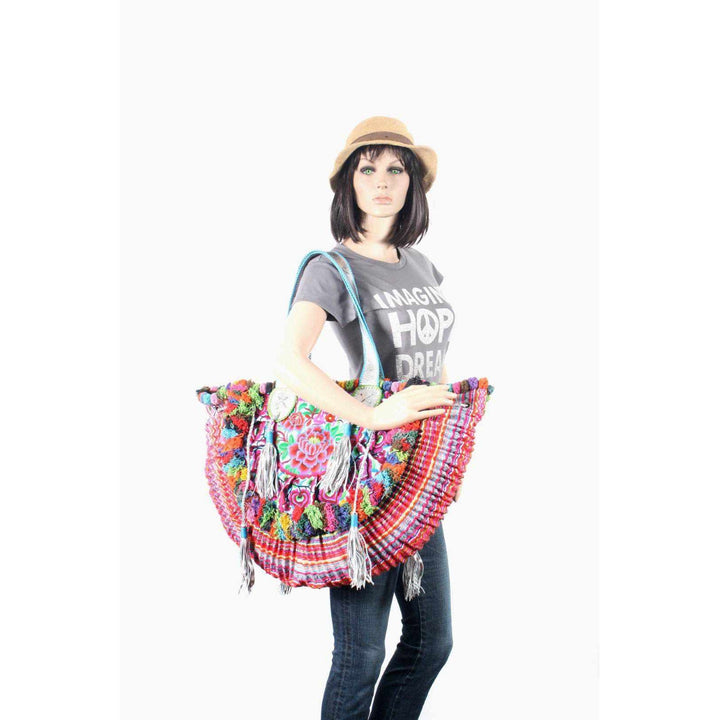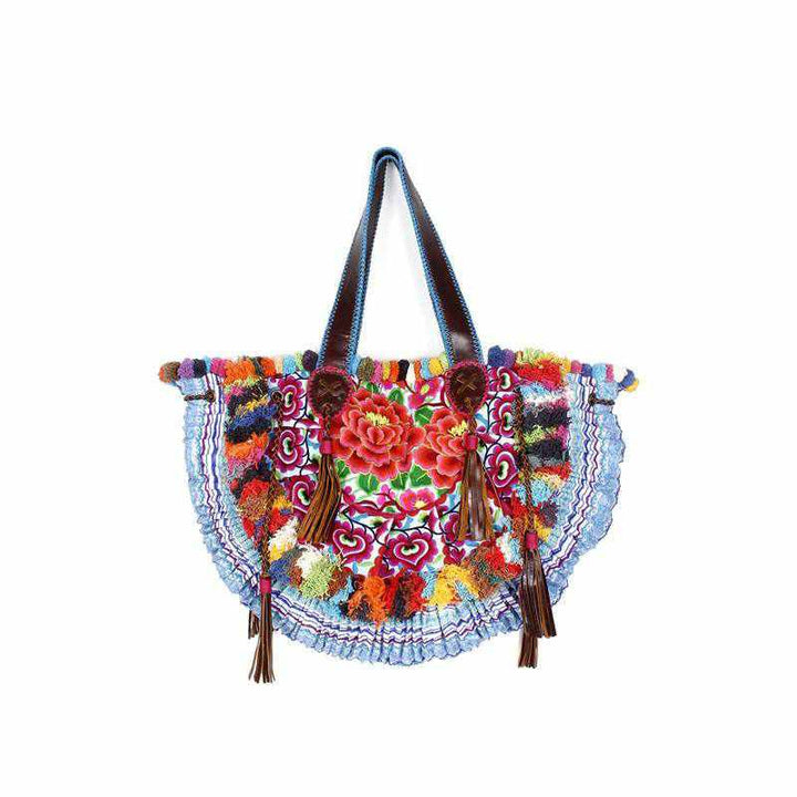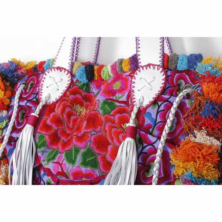 Our Half Moon Ibiza Leather Tote is part of our Thai Vintage Collection, a group of beautiful items handmade with traditional hand embroidered fabrics in Northern Thailand by women artisans. The skirt fabric used in these bags is hand embroidered and finished off with naturally dyed pompoms, each handmade. The bags adorned with additional handmade pom poms and uses genuine leather for the handles. It has a sturdy metal closure on top.