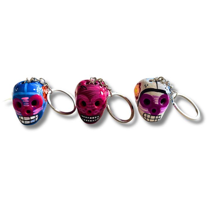 Add a vibrant touch to your keys or bag with this hand-painted mini skull keychain, crafted by the talented artisan Cecilia in Mexico. Made from traditional Mexican barro (clay), each keychain is a unique piece of art, showcasing colorful, intricate designs that celebrate Mexican culture. Assorted patterns ensure every keychain is one-of-a-kind, making it a perfect gift or personal keepsake!