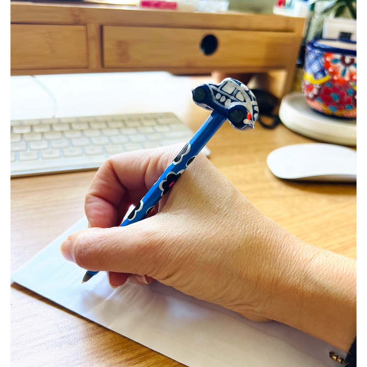 Add a pop of personality to your writing with this VW Bug Hand-Painted Pen, crafted by the talented Cecilia in Mexico. Each pen features a colorful VW Bug design, showcasing intricate hand-painted details that celebrate Mexican artistry. Perfect as a gift or a unique desk accessory, these pens are as functional as they are beautiful.