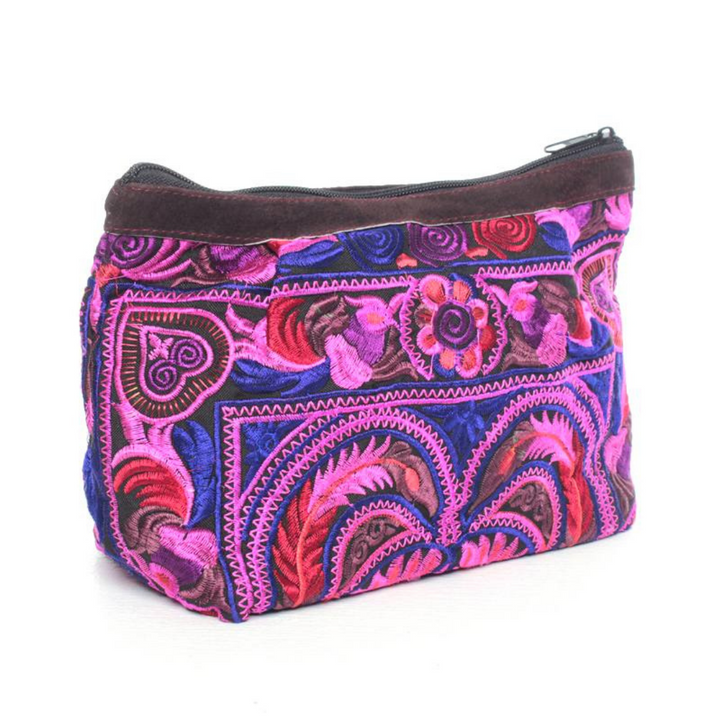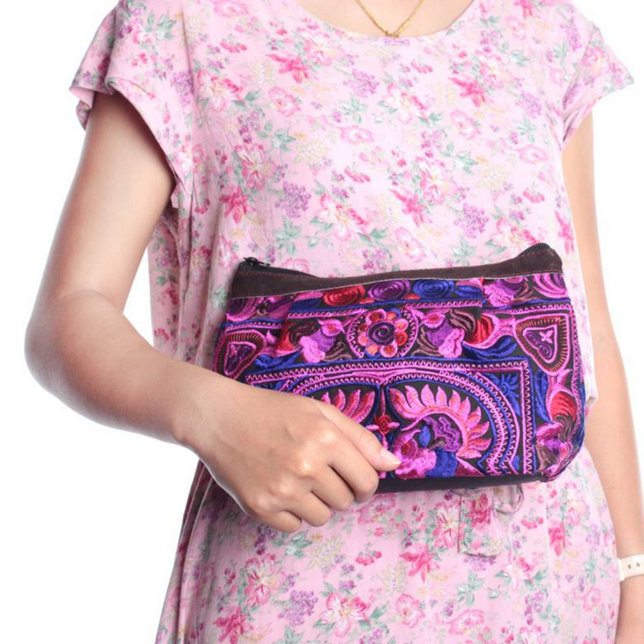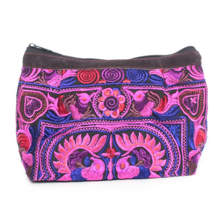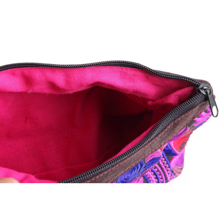 This gorgeous hot pink embroidered bag with pink cotton lining, is handmade using a flower and bird inspired traditional fabric from the Hmong hill-tribes in Northern Thailand.