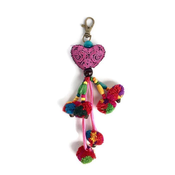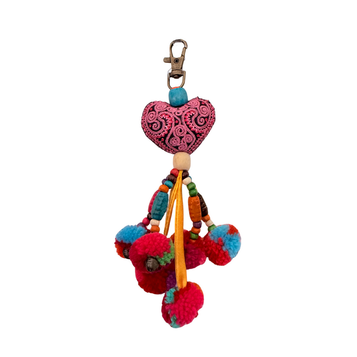 Add a pop of color and character to your handbag or keys with this lovely heart pom pom zipper pull/keychain! Handcrafted by Nee in the highlands of Thailand, using embroidered fabric, handmade pompoms, and wood beads, this piece is a beautiful expression of traditional craftsmanship.