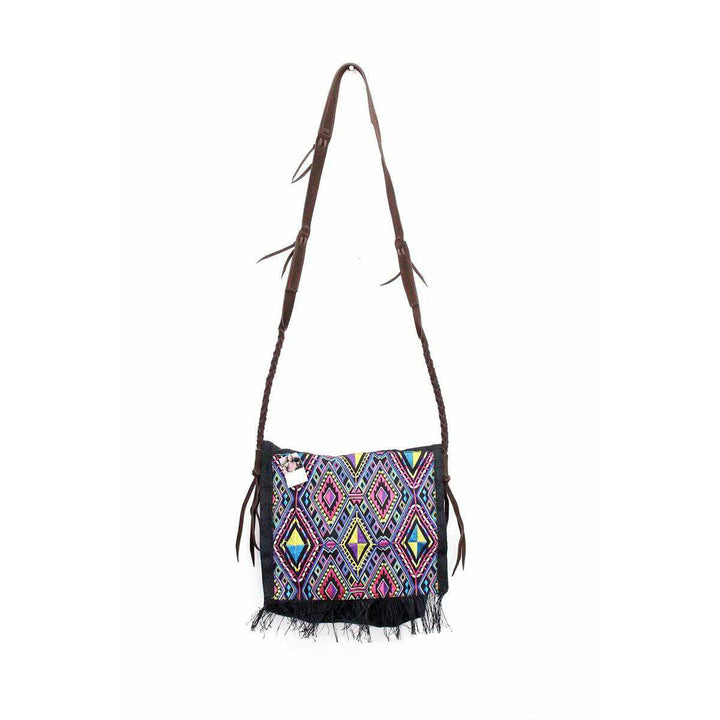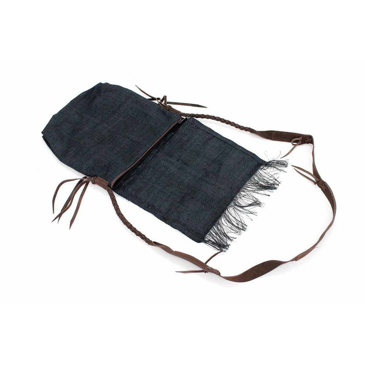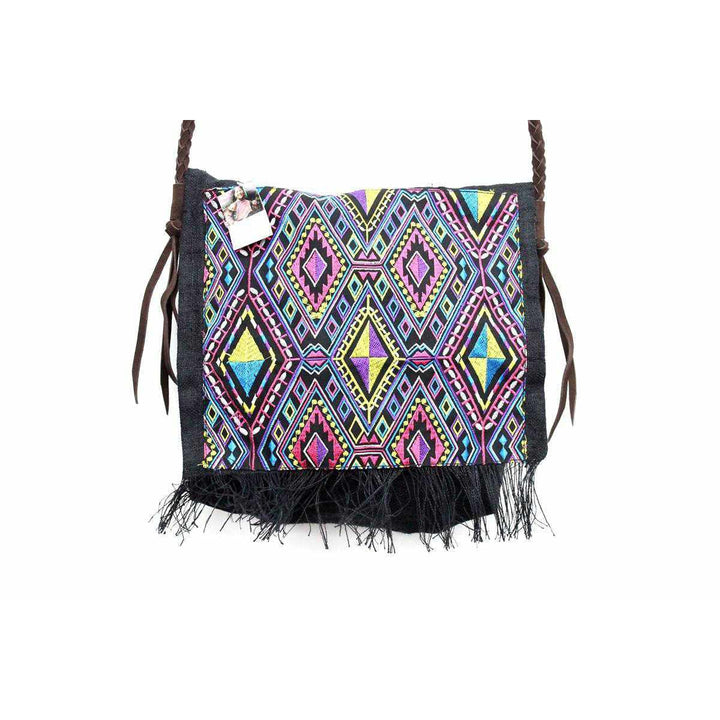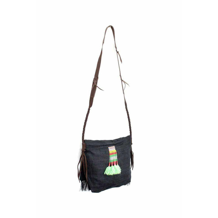 A bohemian style shoulder bag, handcrafted by Thai Artisans that features an embroidered geometric pattern black hemp natural, brown cotton lining, adorned with brown leather tassels.
