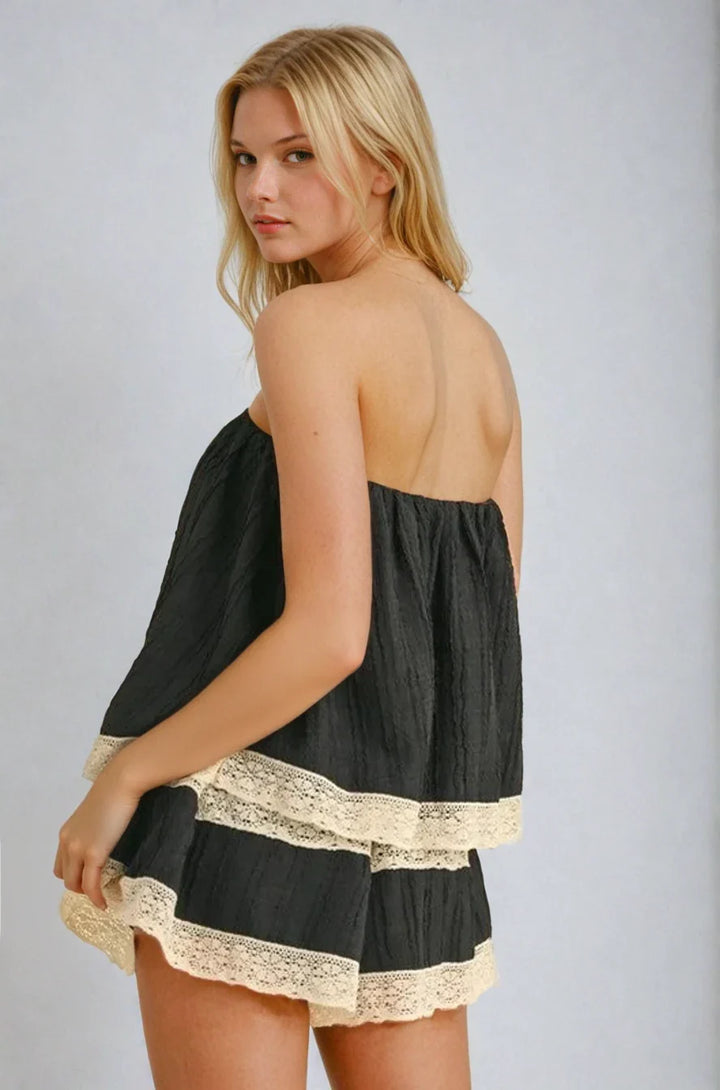 Crafted from lightweight, textured fabric in a rich black hue, the Isla is finished with delicate cream lace trim for a romantic, vintage-inspired touch. The strapless, bandeau-style top adds a flirty flair, while hidden shorts underneath provide confident coverage—making it your go-to for seaside getaways, brunch dates, or simply dancing barefoot in your backyard.