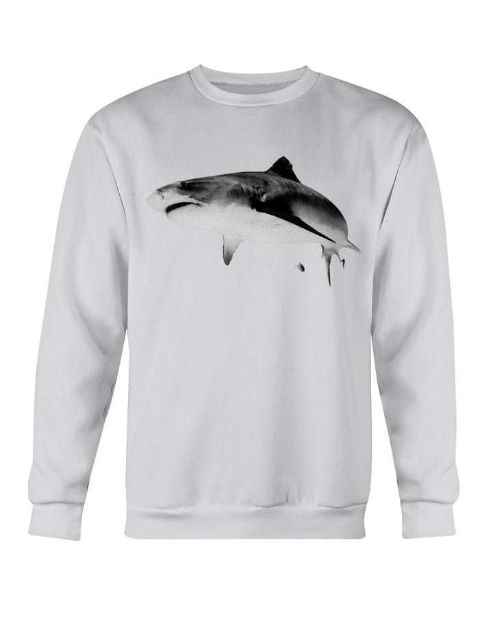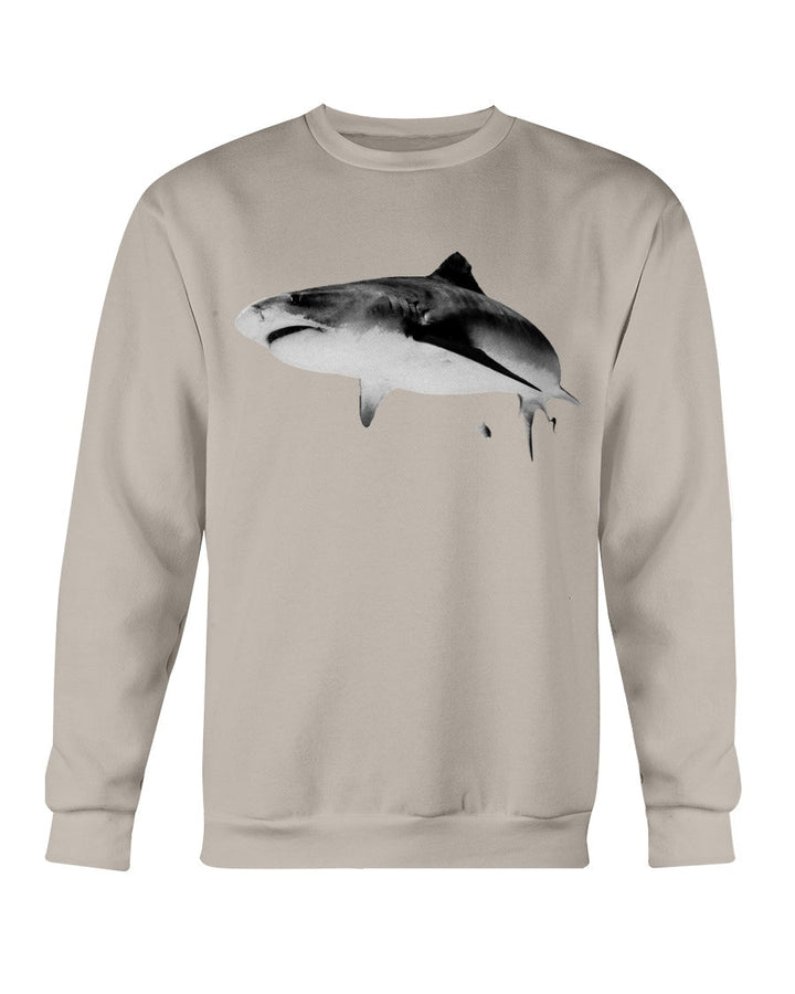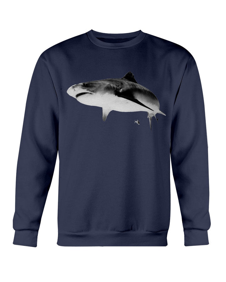 A unique and artistic Crewneck Sweater featuring a photograph of a Tiger shark named Joker taken in the Bahamas. This sweater has a vintage feel and is made of environmentally-friendly cotton. Perfect for ocean lovers and those who appreciate marine life, it is ideal for casual wear and beach outings. Great for Shark Week celebrations and as a gift for wildlife enthusiasts. Or really any occasion, how could you not like Tiger Sharks?