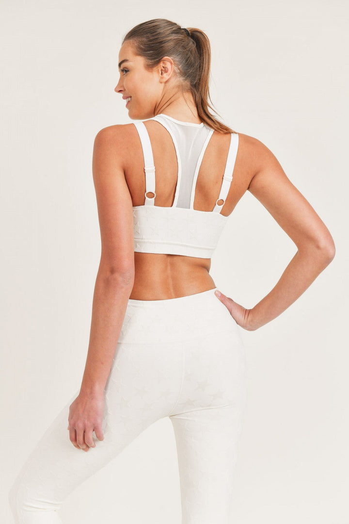 Featuring a subtle star-jacquard texture and a breathable mesh overlay, this stunner adds just the right touch of glam while keeping you cool when the heat is on. The racerback mesh design ensures airflow and flexibility, while adjustable straps and removable pads allow for a personalized fit.