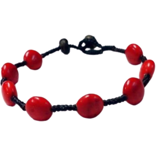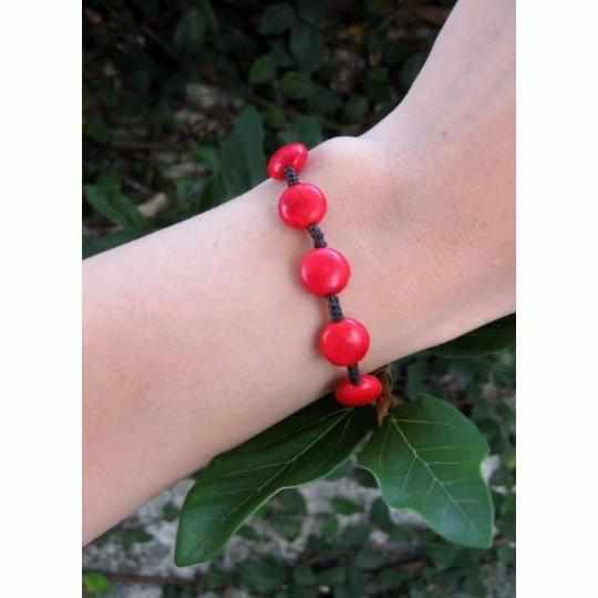 10 8mm red lentil shaped beads are knotted together with brown waxed linen cord with tiny, delicate stitches. Perfect to stack with other bracelets.