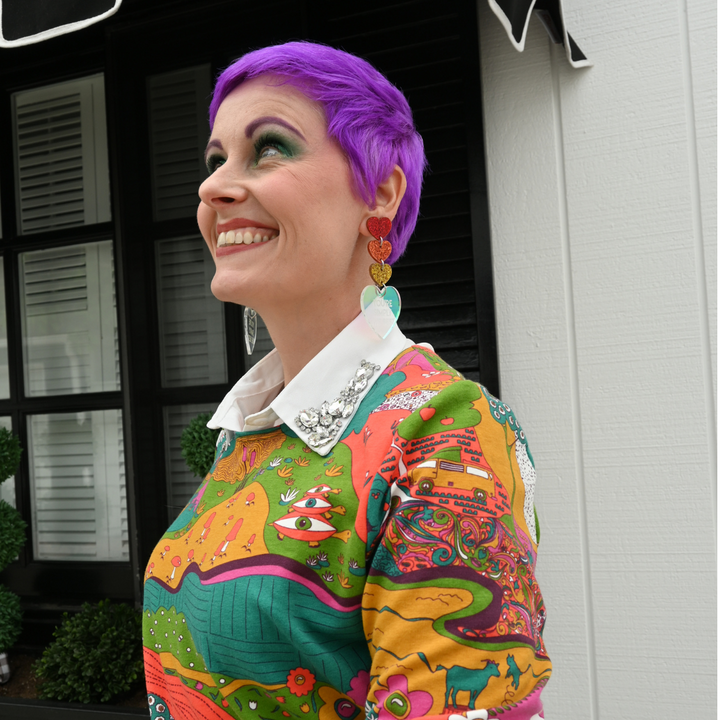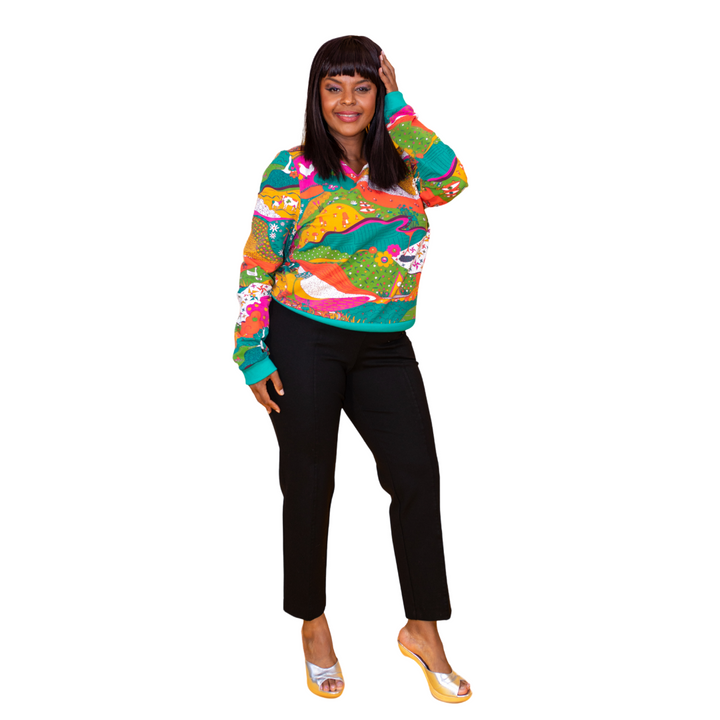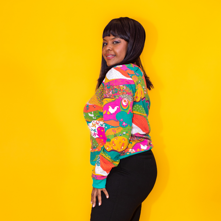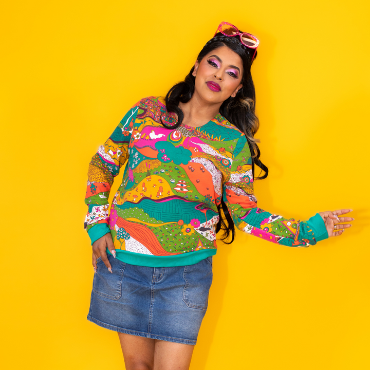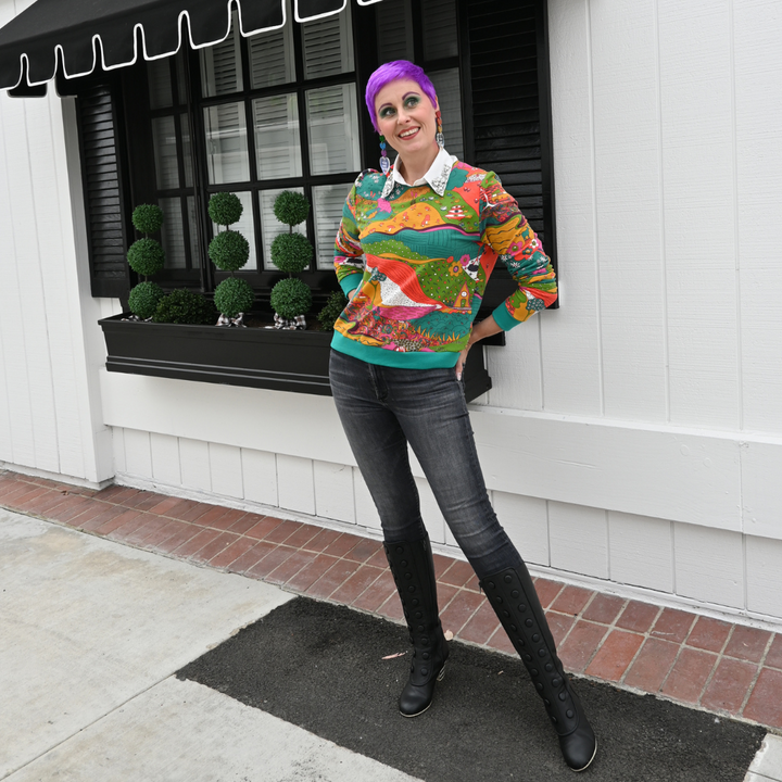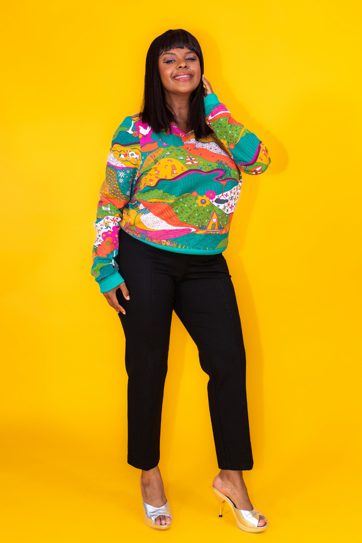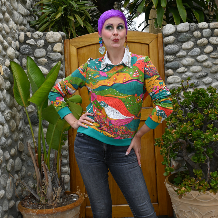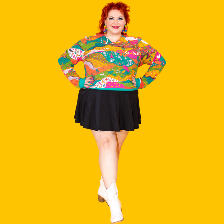 This gorgeous pullover features our original vintage inspired landscape print in ALL 9 SIZES in a soft, lightweight French terry fabric! This cropped top features our best-selling design with animals, mushrooms, rivers, fields, a-frame houses, etc. is designed to be worn with high-waisted skirts, pants or shorts, so please read measurements.
