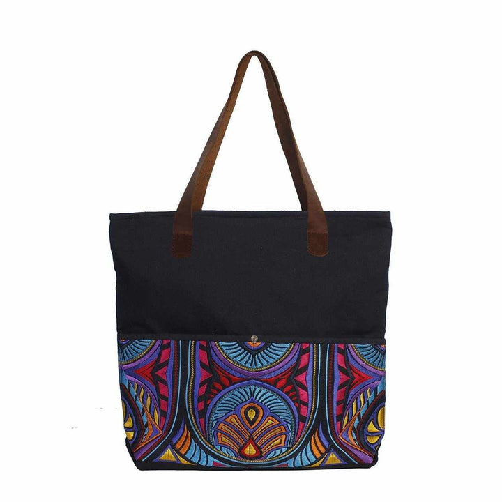 Our Tahj limited edition collection is created from gorgeous embroidery in contrasting, colorful hues. This gorgeous tote combines hand stamped batik fabric adorned with a colorful thread and finished with high quality leather straps. It is lined inside with an inside pocket. This shoulder bag is the perfect everyday purse!