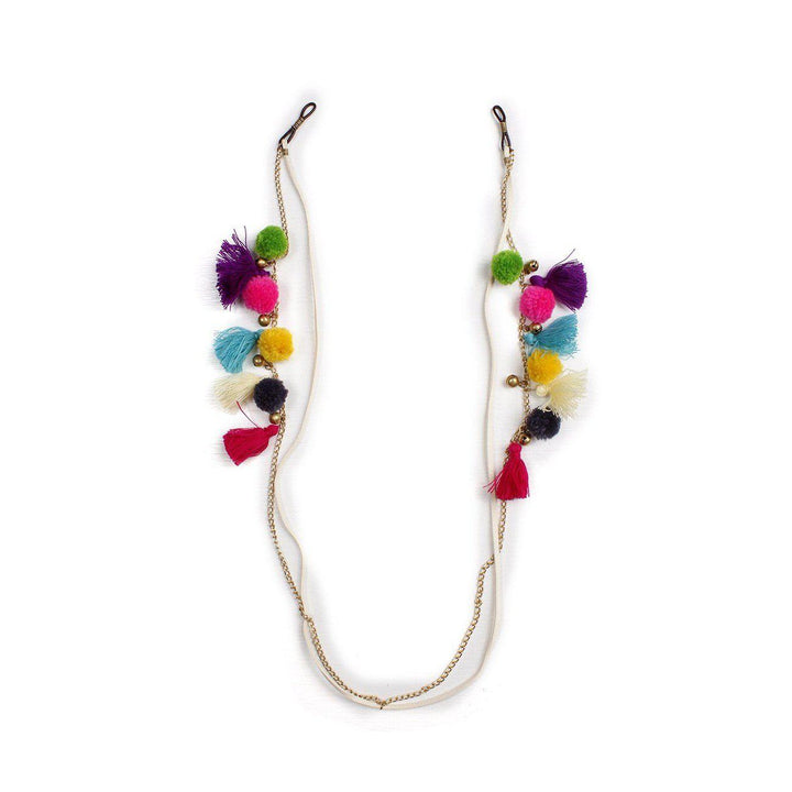 Our Leather PomPom & Tassels Sunglass Holders are Fair Trade, handmade beaded individually by woman artisans in the highlands of Northern Thailand. A strip of genuine leather and a metal chain make up the strap.