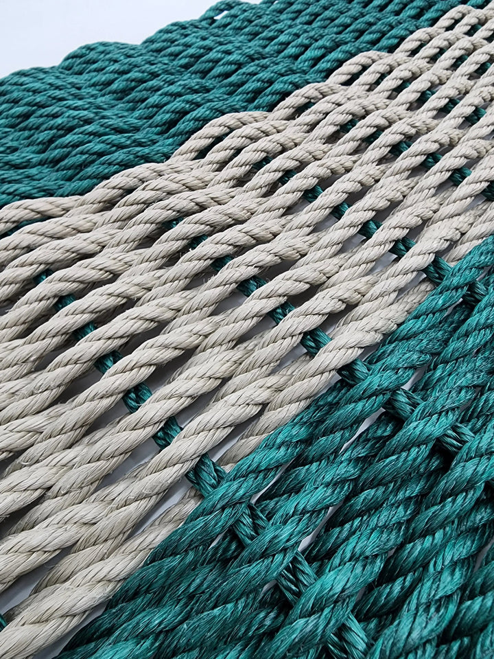 A beautiful Hunter Green and Tan more natural color, hand made rope mat made on the coast of Maine using the very same rope that lobstermen use to tend their traps.