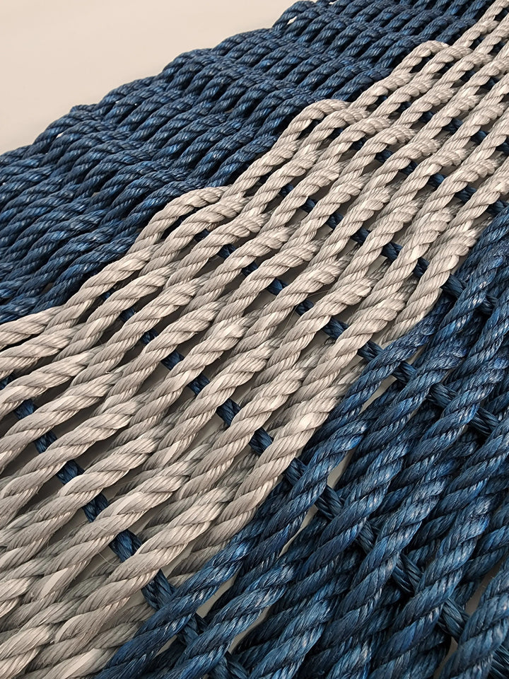 A beautiful Navy Blue and Light Gray, hand made rope mat made on the coast of Maine using the very same rope that lobstermen use to tend their traps.