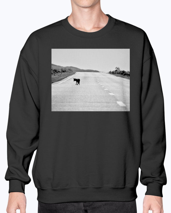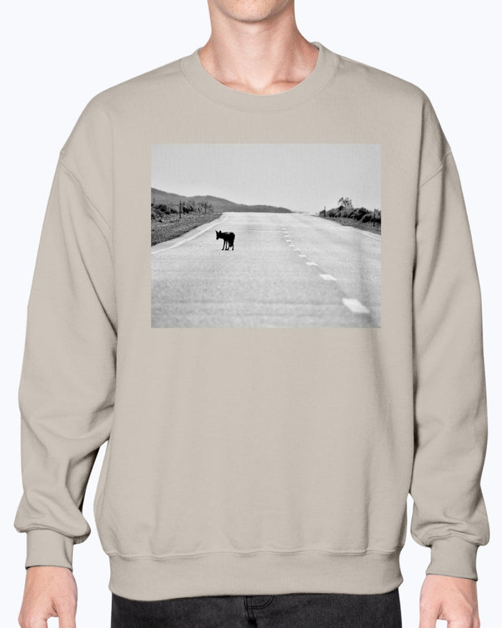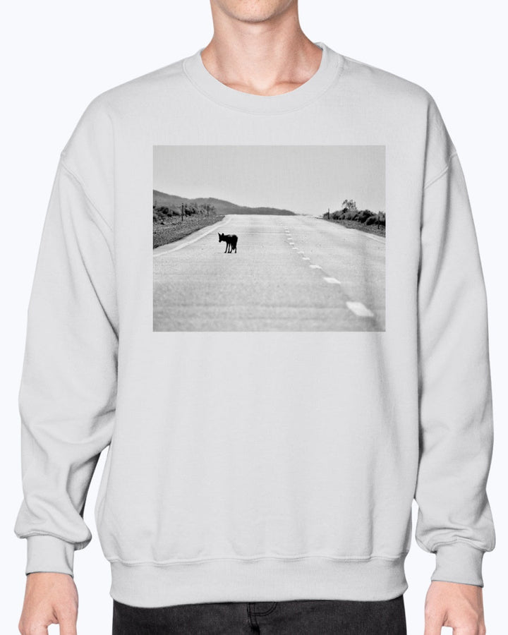 Embrace the spirit of the American wilderness with our Lone Coyote Crewneck Sweatshirt. This isn't just a cozy layer; it's a powerful narrative, featuring a captivating black-and-white photograph of a lone coyote on a highway, suspended between the iconic landscapes of Joshua Tree and Death Valley National Parks. The image itself exudes a profound sense of resilience and wild beauty, making this sweatshirt a compelling choice for nature lovers and outdoor enthusiasts.
