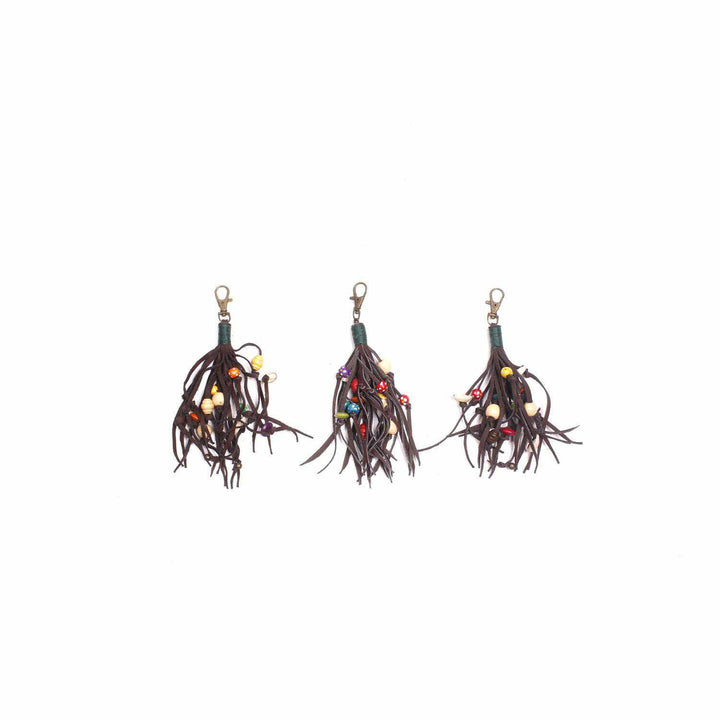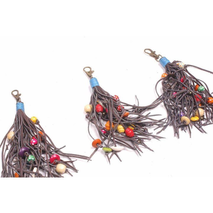 Add artisan-crafted charm to your everyday accessories with our Lotus Beaded Boho Bag Charm. Ethically handmade in Northern Thailand by women artisans, this standout piece features individually hand-cut leather strips, expertly tied and finished with waxed cotton cord. Colorful beads are woven into the tassel design for a vibrant, playful touch—each one completely unique.