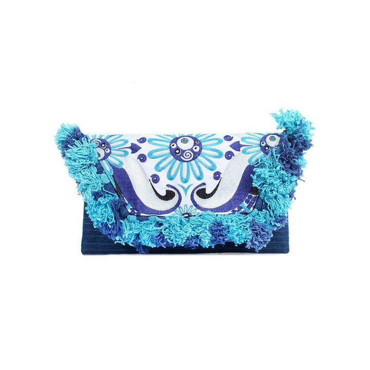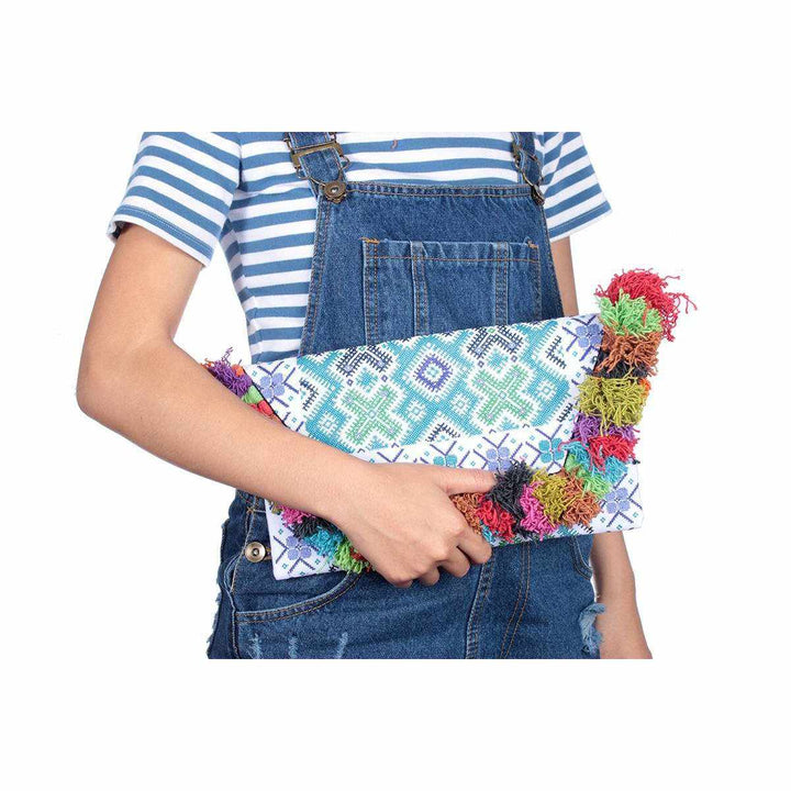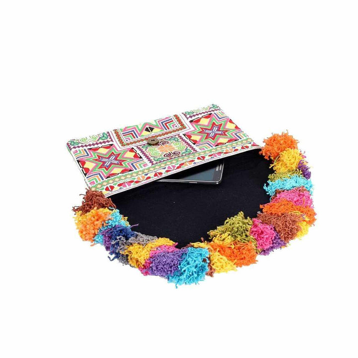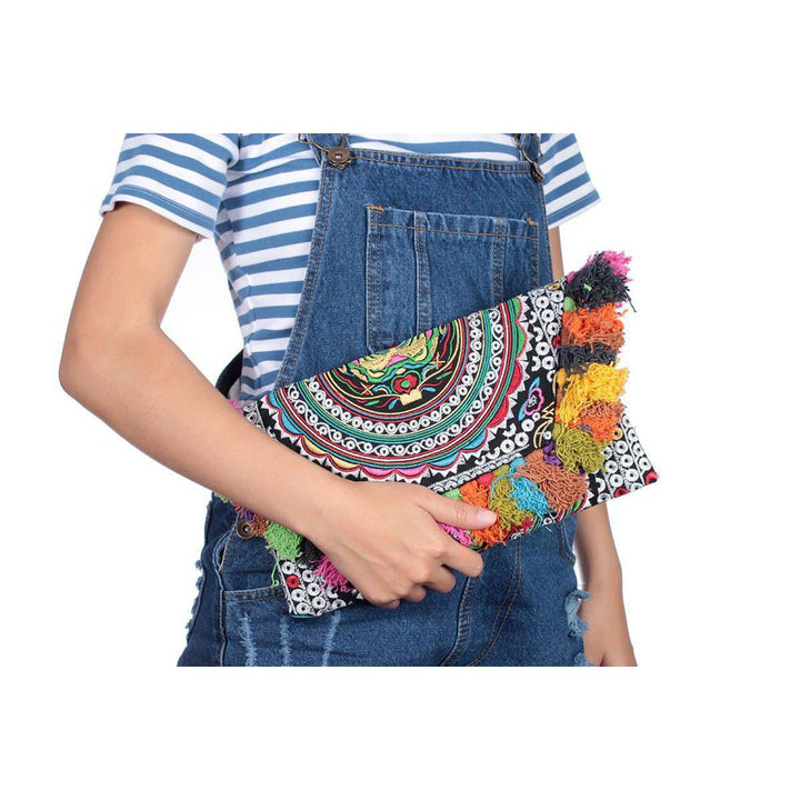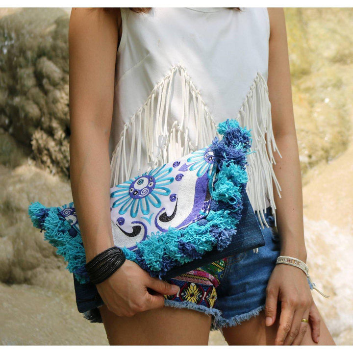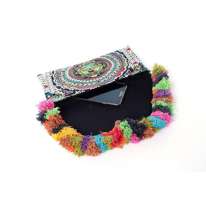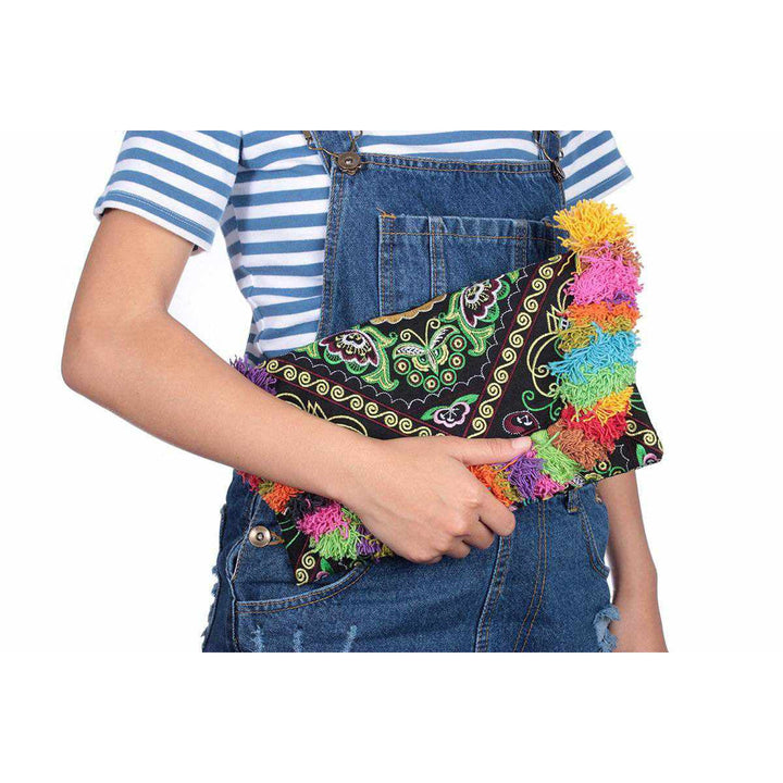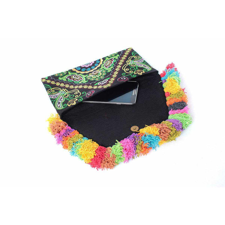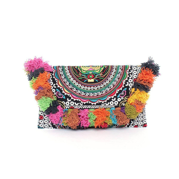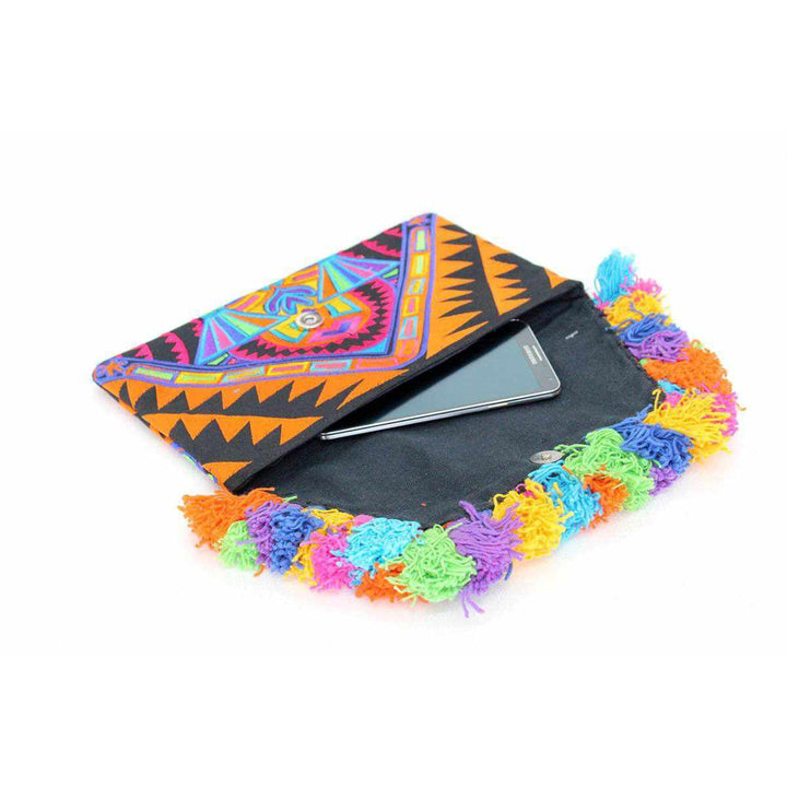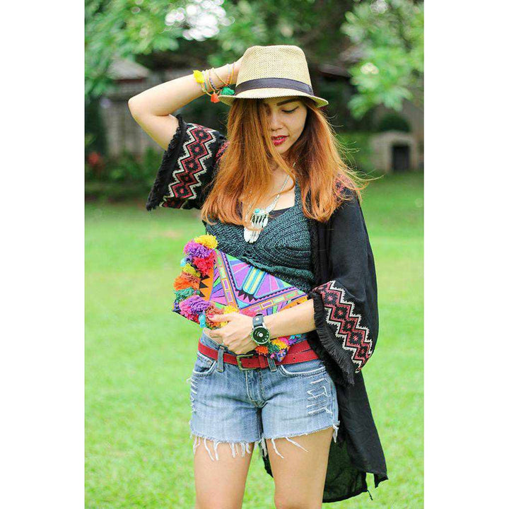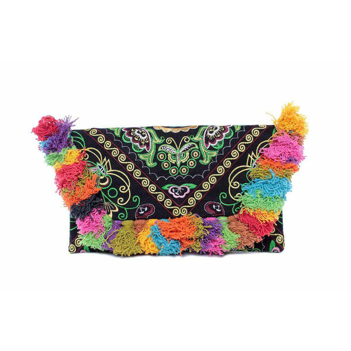 Our Lotus Star bag is part of the limited edition collection here until it's gone! It is created from gorgeous embroidery in contrasting hues. Handmade by Hmong women artisans that features an embroidered tribal pattern embroidered fabric, black cotton lining, adorned with multi colored fringe pom poms.