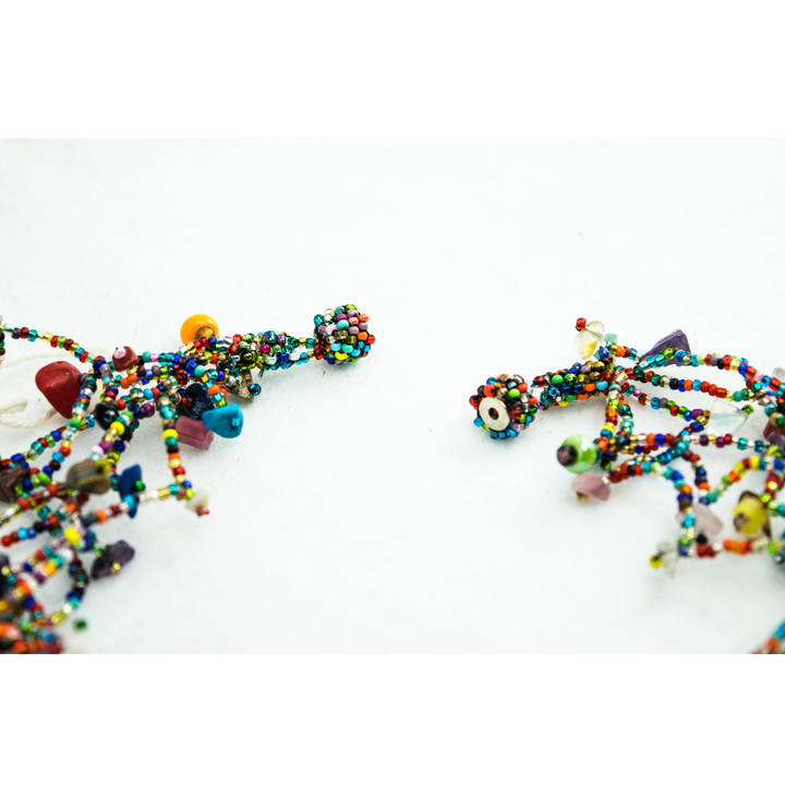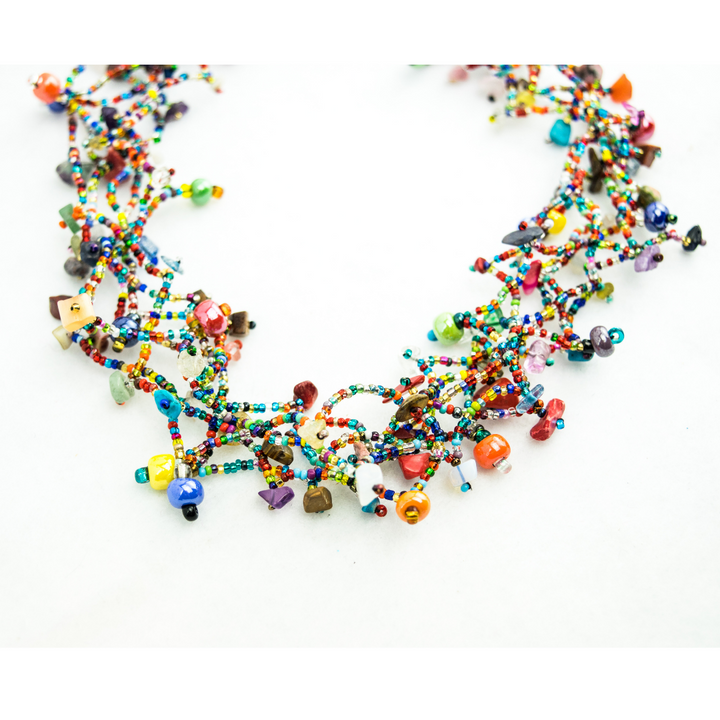 Elevate your style with our best-selling Luzy necklace, a stunning statement piece that exudes exotic flair. Handcrafted with meticulous care by Maria in the highlands of Guatemala, this necklace features intricate beadwork adorned with semi-precious stone chips, adding a touch of intrigue to any ensemble.