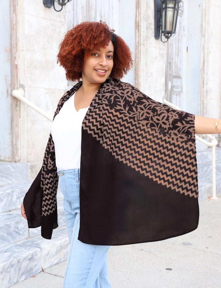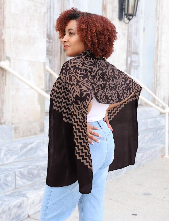 A beautiful hand block printed scarf. The diagonal zig zag stripes on this scarf pair wonderfully with the leafy floral print. This scarf has a black base with a peachy beige print on modal. Modal is a plant based sustainable material and the fabric is very silky, light-weight and soft; perfect for draping and accessorizing.