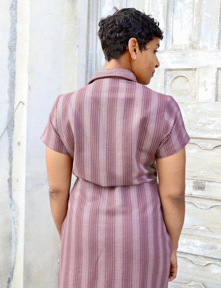 - This purple button up wrap dress is designed in New Orleans and handmade in India