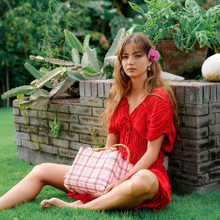 Designed with intention, MARCHE features a timeless checker-weave and a smooth bamboo handle that rests effortlessly in hand. Light yet structured, it moves with you from sun-drenched market mornings to moonlit strolls—an elegant companion for wherever the day leads.