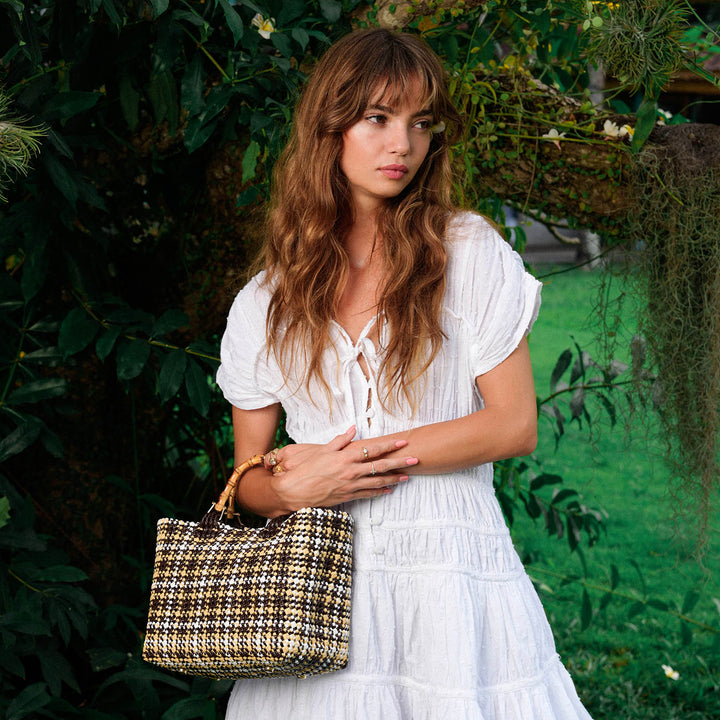 Designed with intention, MARCHE features a timeless checker-weave and a smooth bamboo handle that rests effortlessly in hand. Light yet structured, it moves with you from sun-drenched market mornings to moonlit strolls—an elegant companion for wherever the day leads.