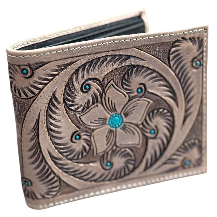 Men’s Western bi-fold wallet tooled floral Cow Skull Aces Cards details by Double B Wild Rags