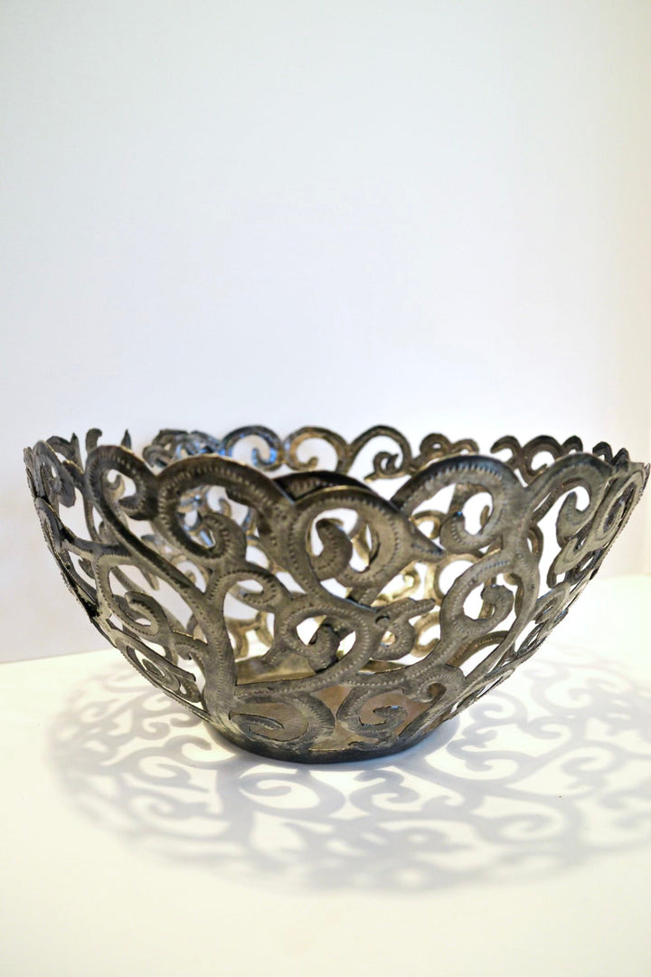 Intricately detailed metal bowl, handmade with recycled steel. Perfect for decor, not meant for food (except the kind you plan to peel or with something like our Cotton Napkin underneath!)