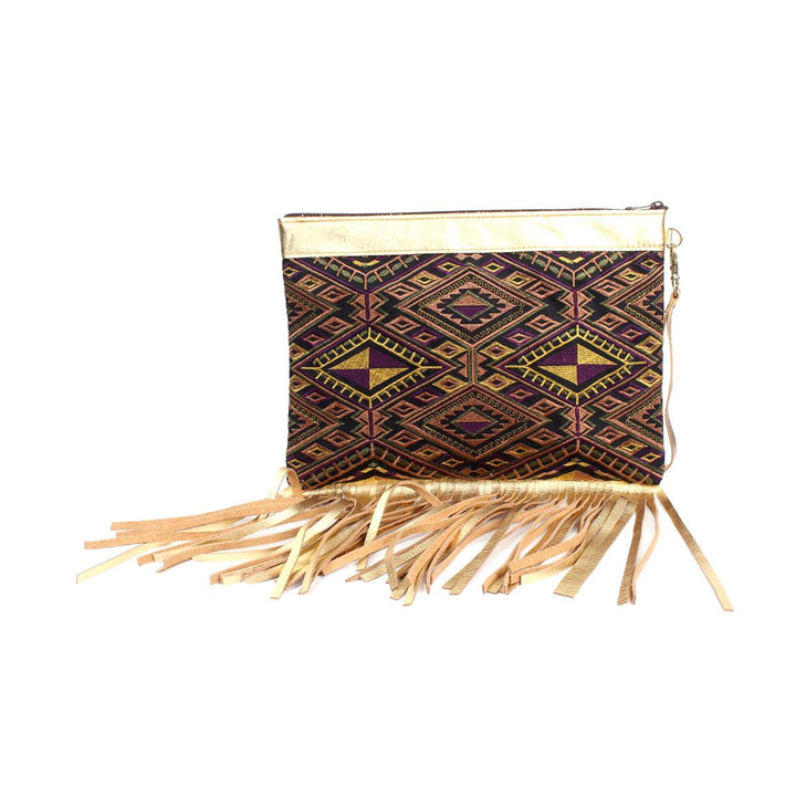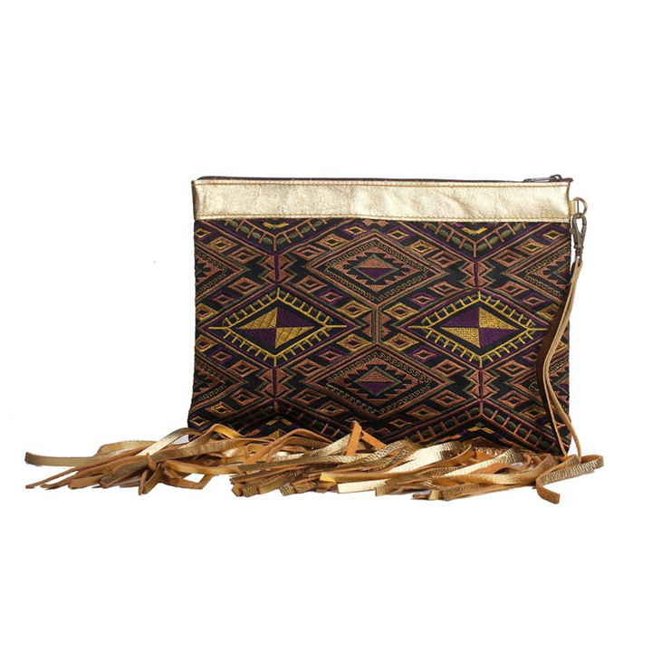 With its vibrant embroidered cloth, leather trim, and metallic fringe, this wristlet combines style and social responsibility. Join us in supporting sustainable fashion and shop our artisan-made collection today!