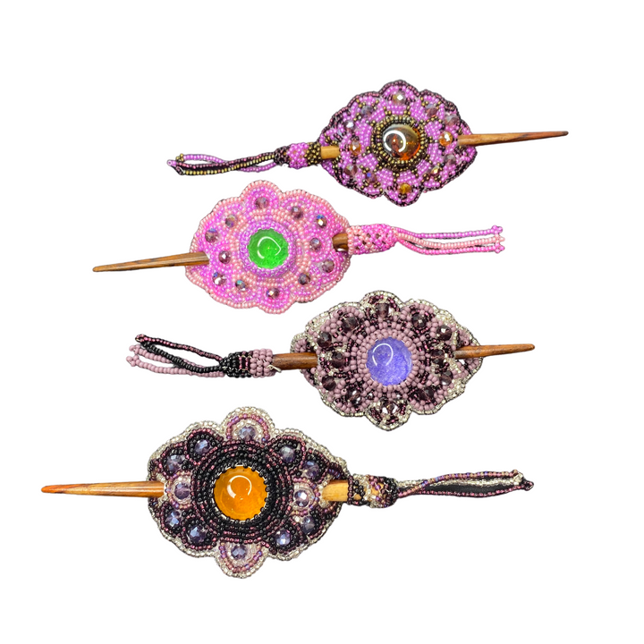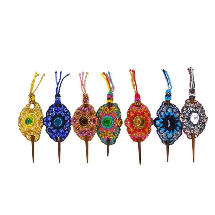 Handcrafted by Maria in the highlands of Guatemala. Adorned with hand-carved wood, first-grade Czech glass beads, and semi-precious stones, this brooch is the perfect accessory for any occasion. Choose from a variety of colors including purple, green, red, turquoise, yellow, white, turquoise/brown, and red/orange to match your personal style.