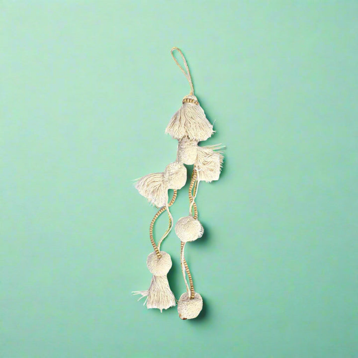 Minimalist, elegant, and globally inspired — this ivory multi-tassel keychain is the perfect touch of texture and style for any bag, jacket, or set of keys. Carefully handcrafted in Northern Thailand by women artisans, it’s made from soft cotton yarn and finished with delicate pom poms and tassels in warm ivory tones.
