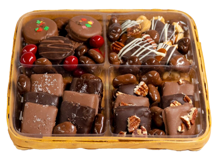 This North Star Sampler is the ultimate treat for any confection lover. It features a beautiful four section wicker basket filled with our hand-selected favorites, including Sea Salt Caramel, Pecan Toffee, and our Signature Loon Pies. Each basket also includes a seasonal variant, making it the perfect gift for any occasion. Satisfy your sweet tooth with this delightful assortment.