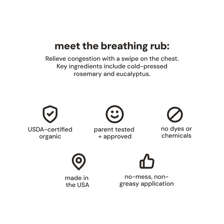 🛡️ Effective formula: Formulated with cold-pressed eucalyptus and rosemary oils, this balm naturally helps to open airways, promoting easier breathing for your little one during times of congestion. (Psst: kids, teens, and parents love these balms, too!)