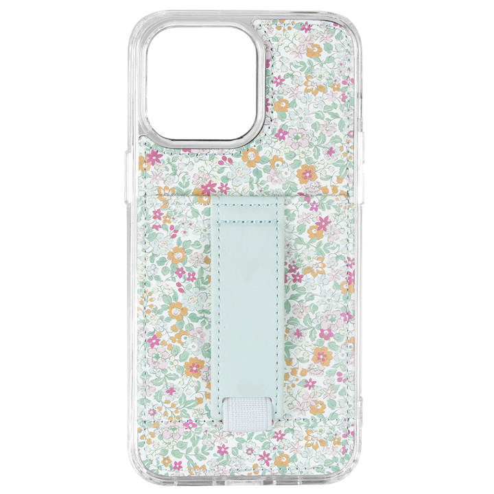 Case Design: Pink, blue and yellow flowers with a solid blue strap