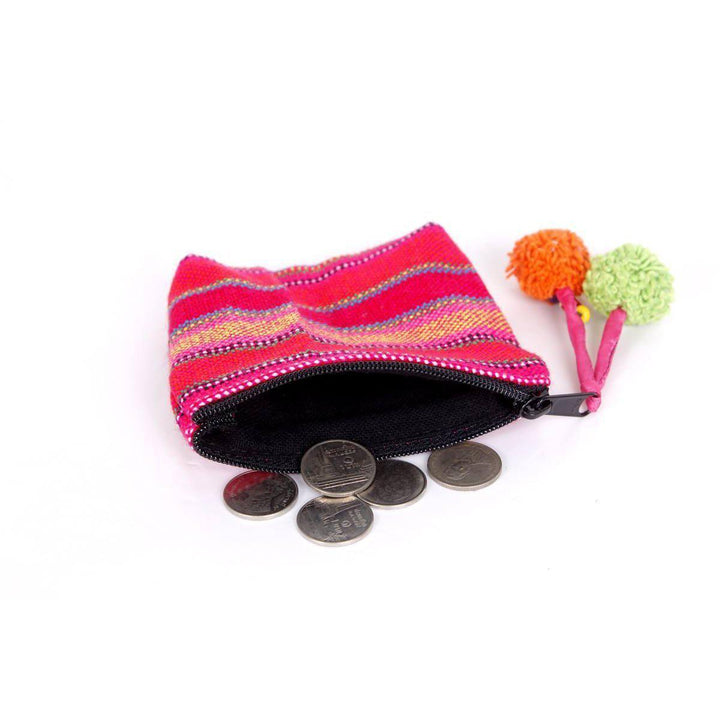 Add a touch of color and culture to your everyday accessories with our Pink Woven Hmong Coin Pouch, part of our Woven Collection. This charming piece is handcrafted by Ae in the highlands of Thailand, featuring beautiful Karen hilltribe woven fabrics that create a unique pattern in every pouch. The pouch is secured with a zipper closure and finished with a handmade silk pompom zipper pull for an extra touch of playfulness.