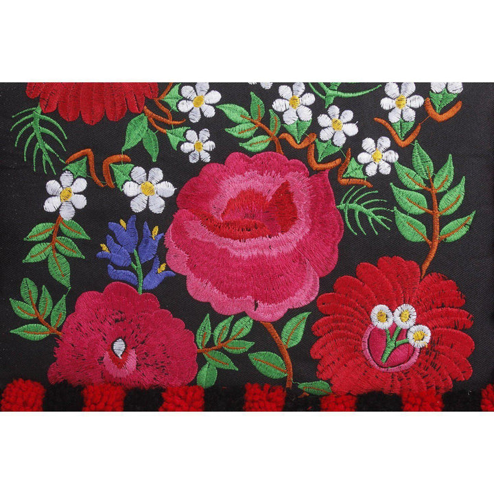 A boho-chic women's wristlet, sustainably made by Thai women Artisans that features an embroidered pattern black cotton lining, adorned with black-red handmade pom poms.