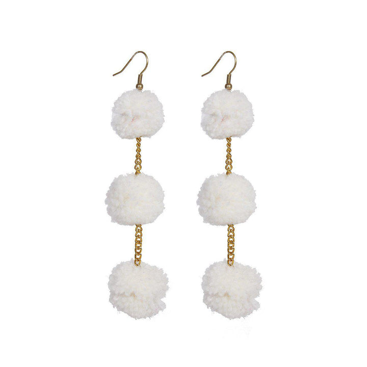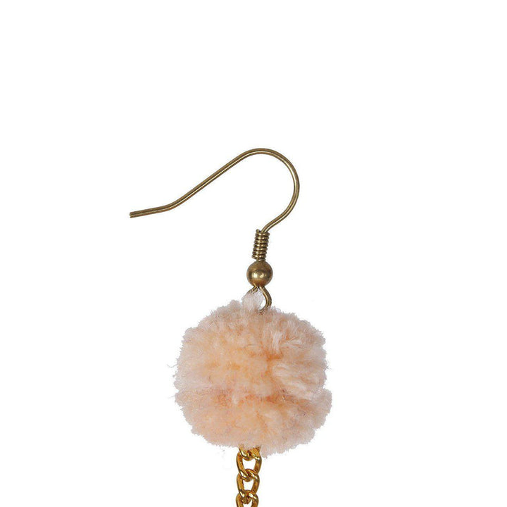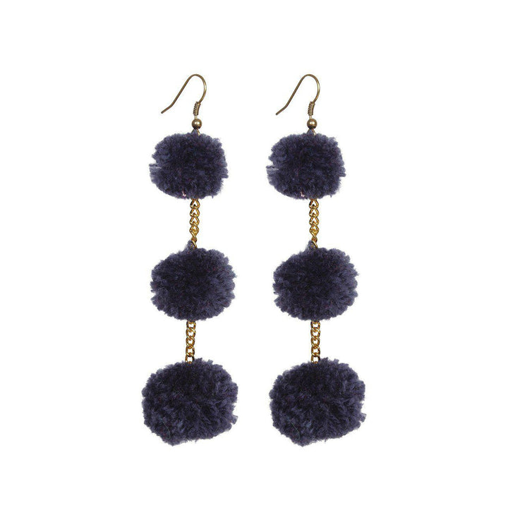 Boho style women's earrings, ethically made using all natural materials adorned with blue pom poms.