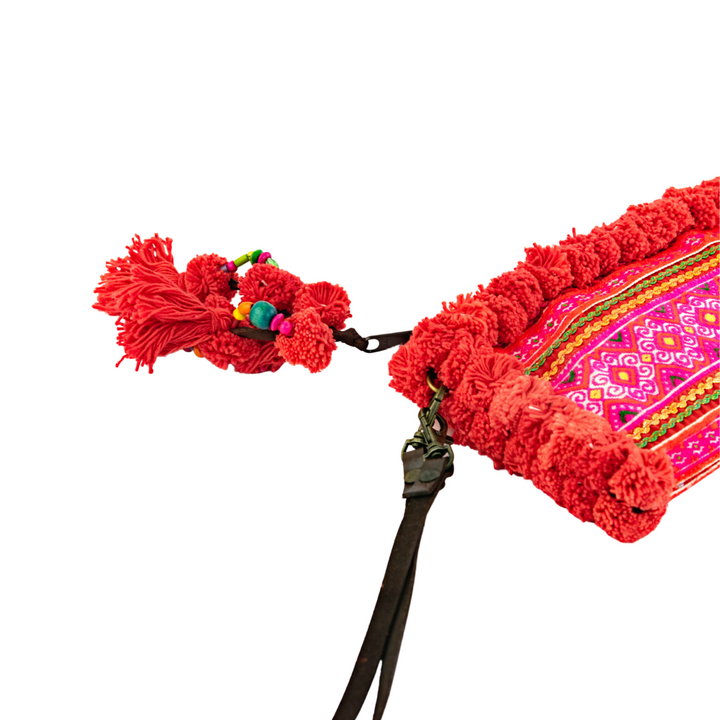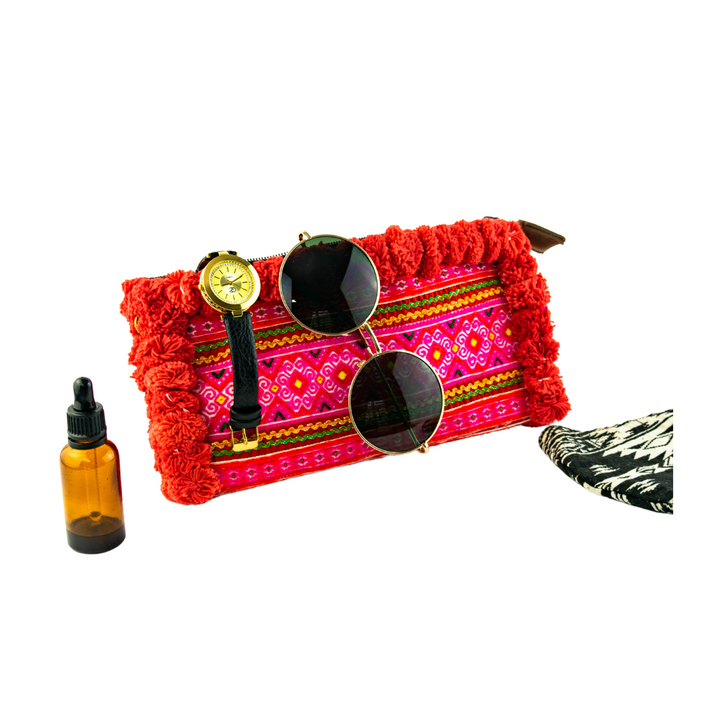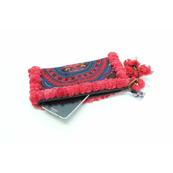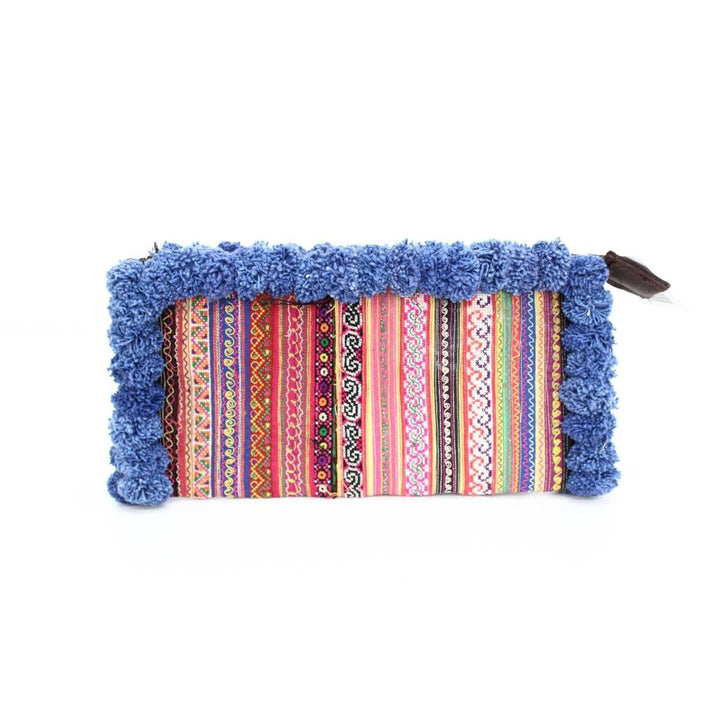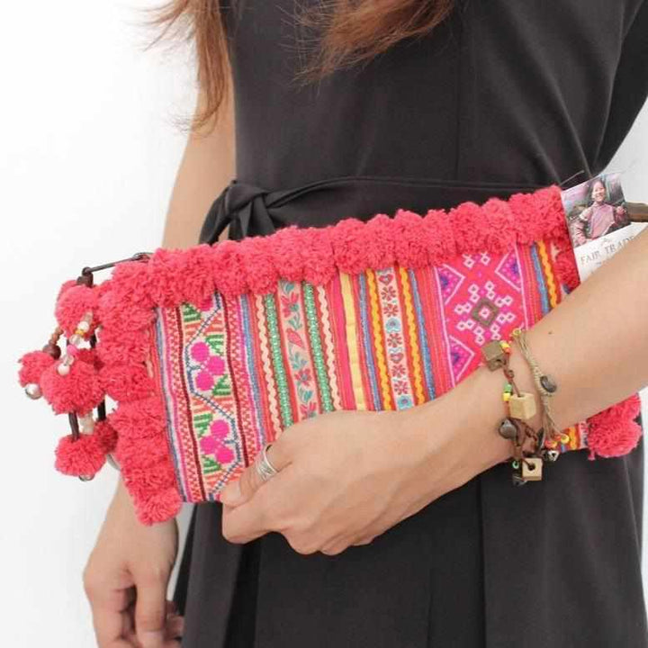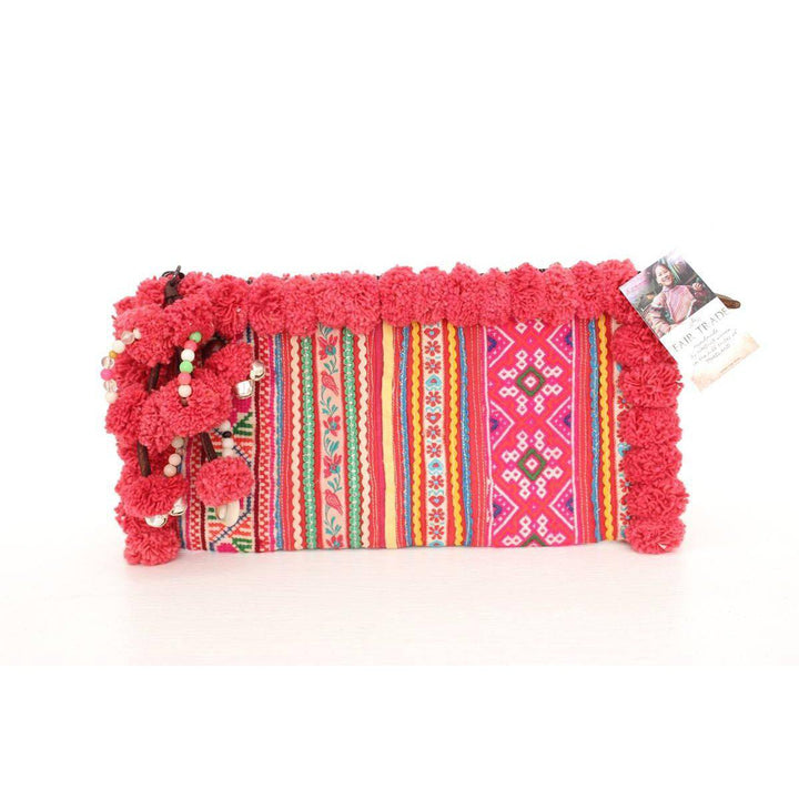 A beautiful clutch bag made from repurposed Hmong baby carriers. Handcrafted by women artisans in Thailand and features high quality black cotton lining, adorned with handmade red pom poms.