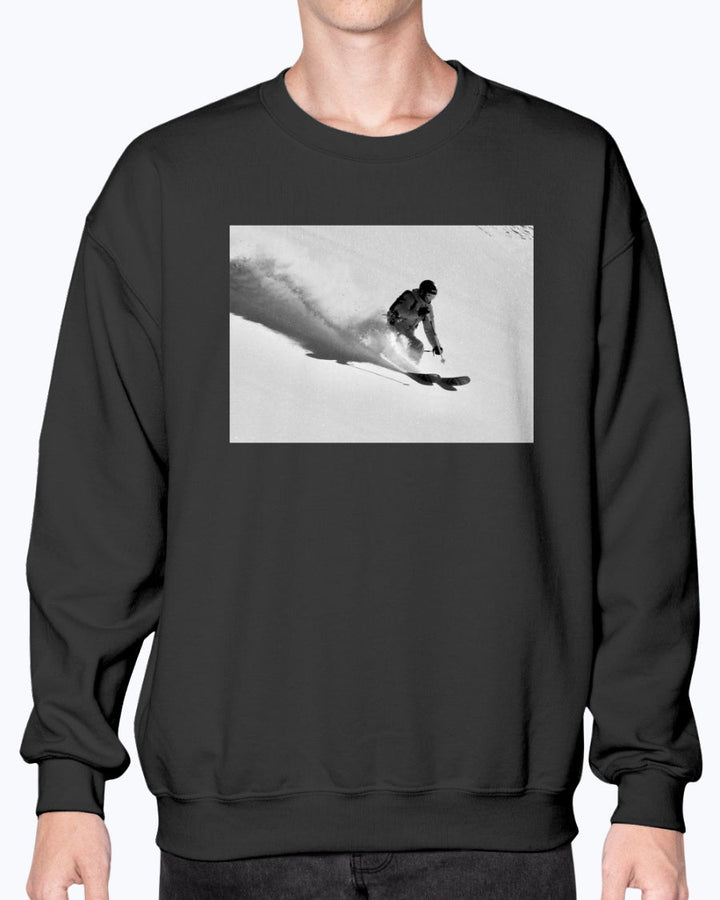 Experience the raw power and grace of the mountains with our Alpine Carve Crewneck Sweater. This isn't just cozy wear; it's a dynamic tribute to the thrill of alpine skiing, featuring a dramatic black-and-white photograph by Robert Moss. Witness an expert skier in the breathtaking French Alps, captured mid-carve, a moment that honors both intense athleticism and the sheer beauty of the slopes.