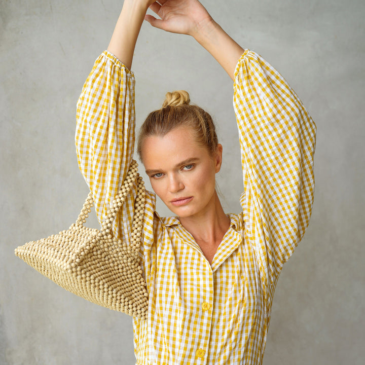 This Pyramid bag is a museum-worthy, sculptural beads piece that strikes a cool, coastal ease. Crafted of natural wooden beads, this arm purse features a sturdy 3-dimensional pyramid shape with 2 bag handles. Show yours off with our Meghan mini gingham dress and your favorite espadrilles.