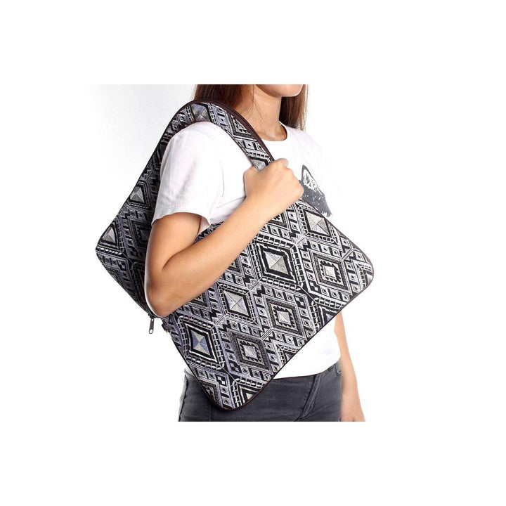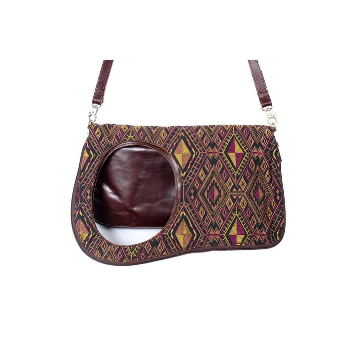 This geometric handbag is the perfect accessory to add some boho chic style to your outfit. Handcrafted in Thailand, this bag features an intricate embroidered pattern with the highest quality leather available! Lined inside with black cotton. Complete with a zippered pocket and leather shoulder strap, this bag is complete with a handy snap-hook that clips around belts loop or stroller straps. This unique bag will steal gazes wherever it goes!