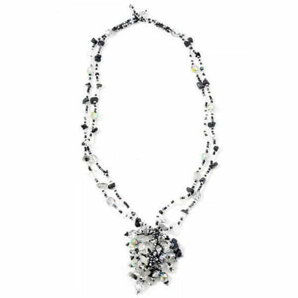 Handmade Roxana beaded necklace is made by hand with an assortment of Czech glass beads and semi-precious stone chips. The focal point of this striking necklace is a beautifully fringed pendant.