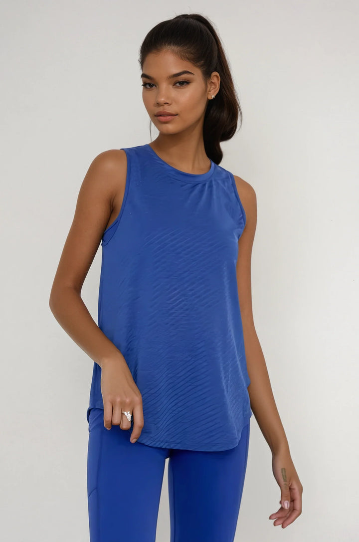 Sheer Striped Mesh Active Tank with Cut-Out Back Blue