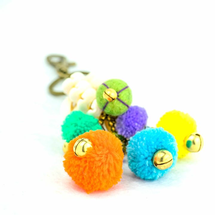 Introducing our Shell Key Chain / Zipper Pull, a beautiful and functional accessory handcrafted by Ae in Thailand. This elevated piece is made with ivory shells and vibrant pompoms, finished with elegant brass metal findings and delicate bells. Its unique design not only adds a touch of whimsy but also ensures you'll never have trouble finding your keys again. Use it as a stylish keychain or as a charming zipper pull to add a splash of color and personality to your everyday items.