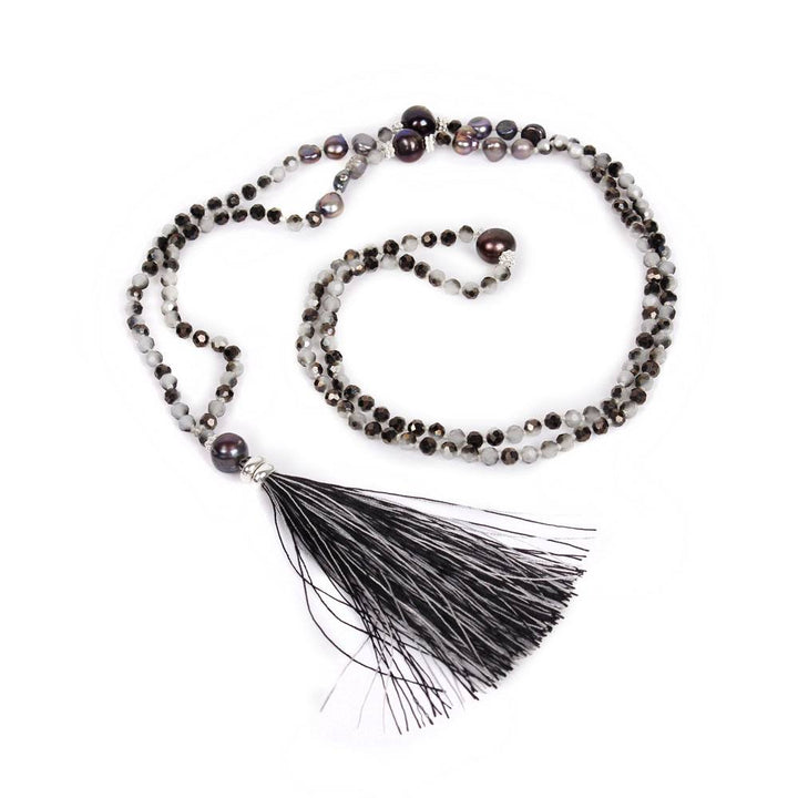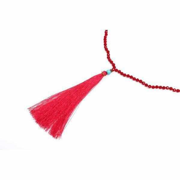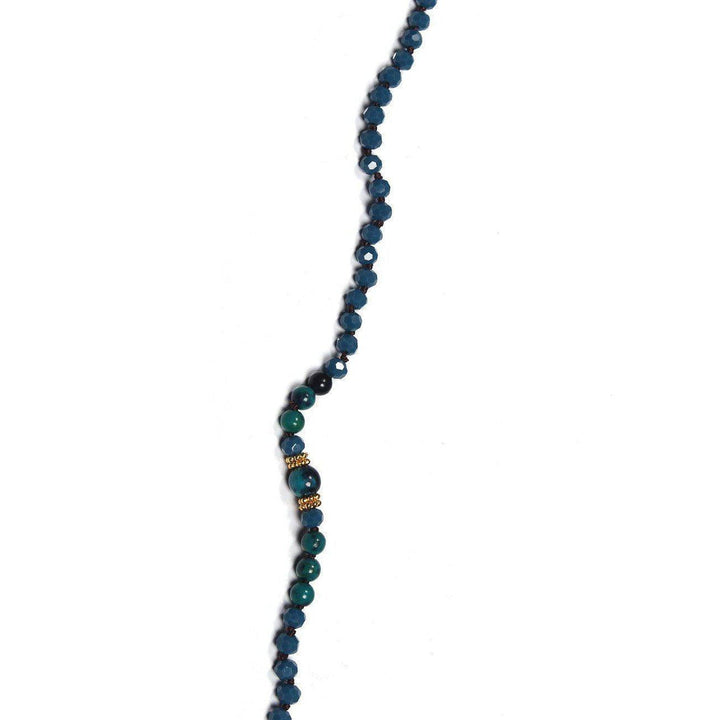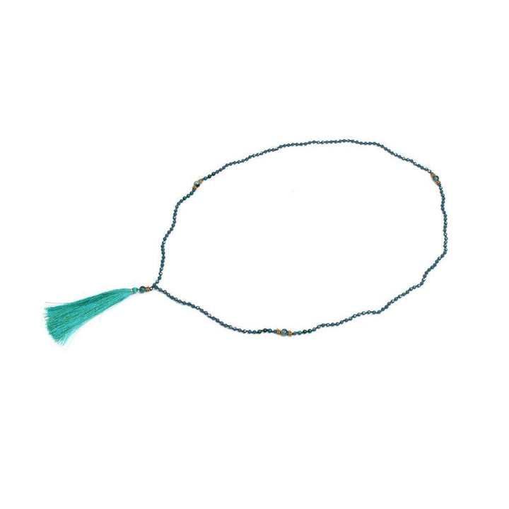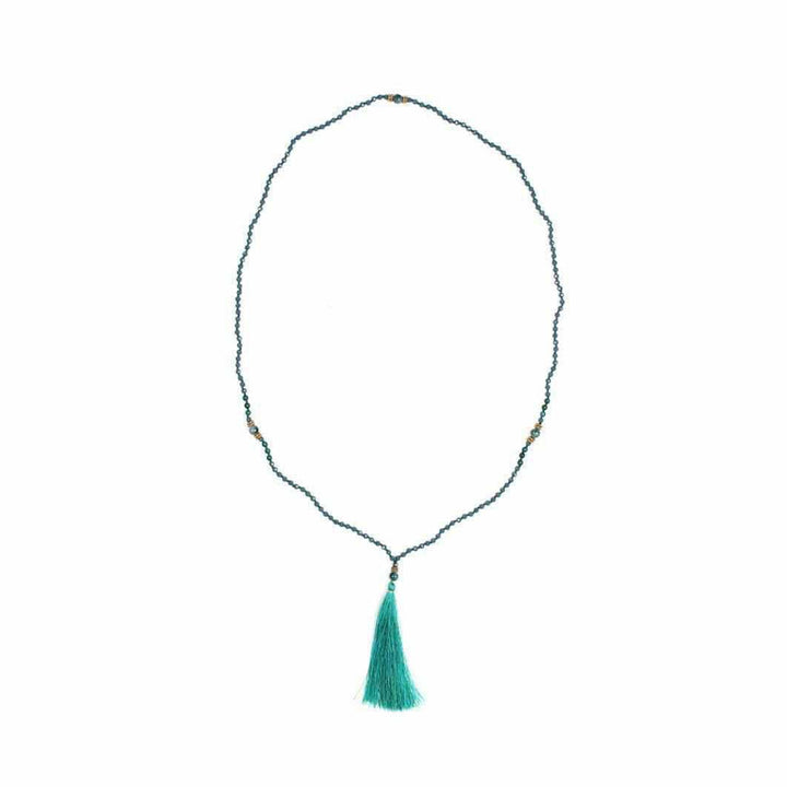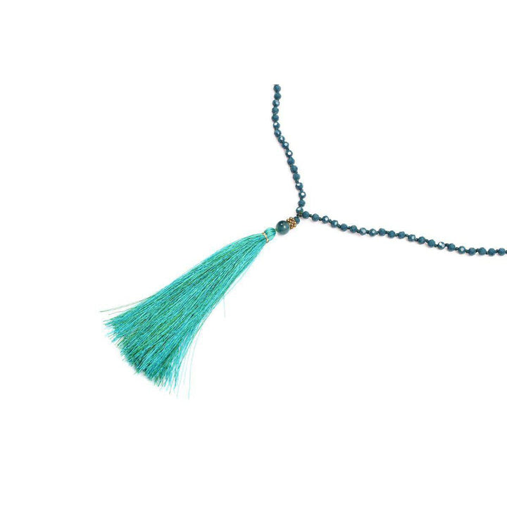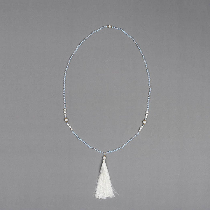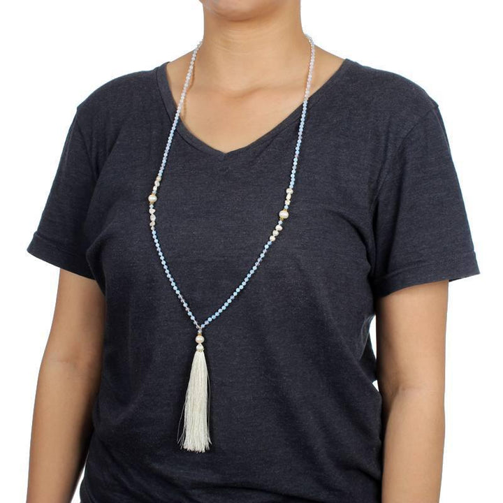 Elevate your accessory game with the exquisite craftsmanship of Tontor's Tassel Necklace, a treasure from Thailand. This stunning necklace artfully combines the sparkle of faceted glass beads with the tranquil beauty of blue howlite beads, each piece thoughtfully accented with a luxurious long blue nylon tassel for an added touch of sophistication.