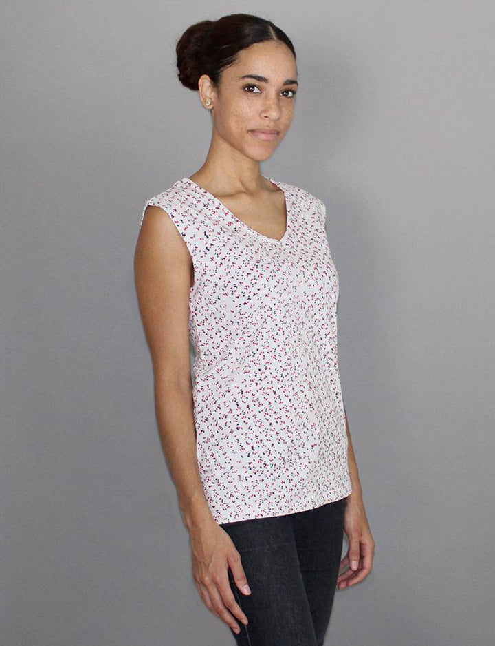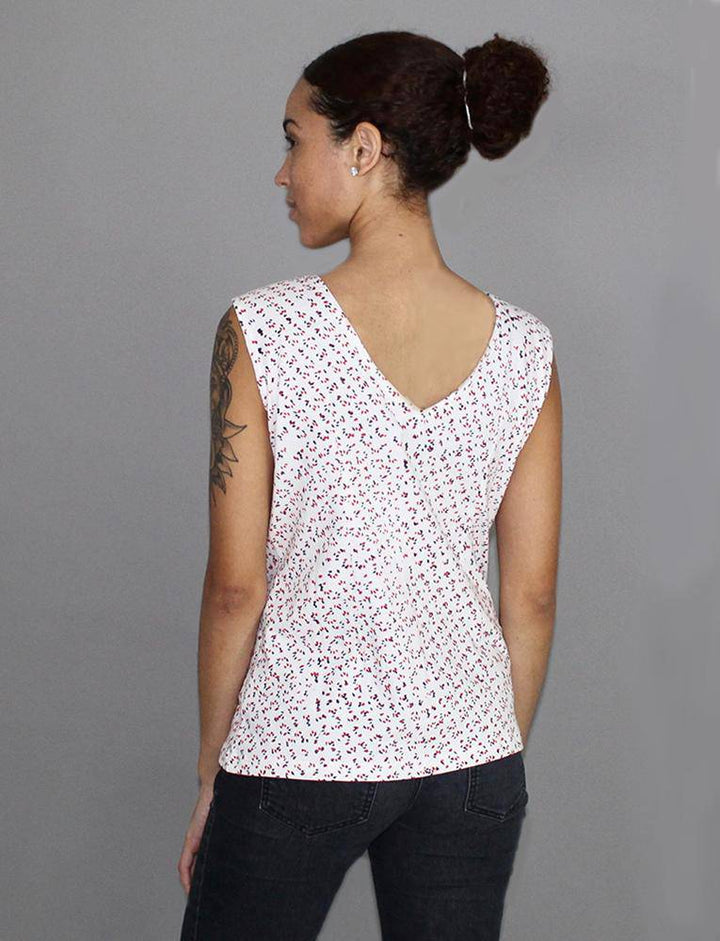 Our white Sparkler Shirt features navy and red splatter dots for a unique, joyful look. The V-neck in the front and low V-neck in the back give it a more sophisticated cut that can be dressed up or down with ease. It’s also sleeveless and made of soft, breathable, eco-friendly organic jersey cotton, making it perfect for Fourth of July, game day, and any other summer day.