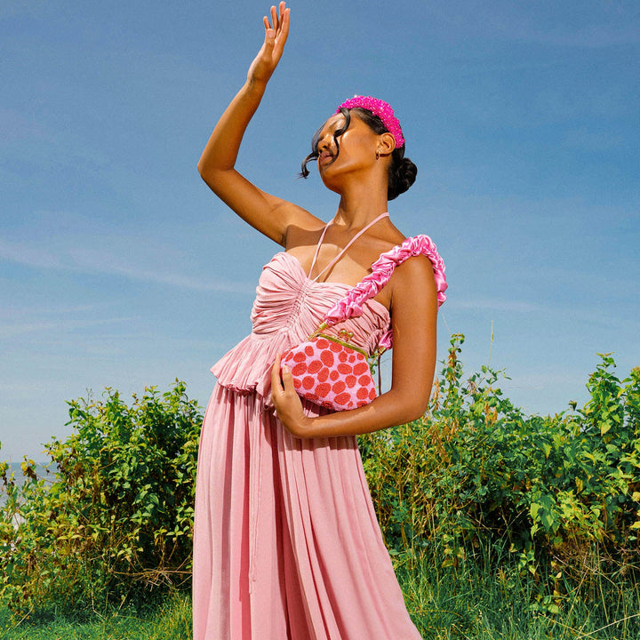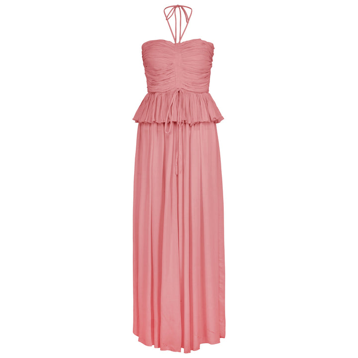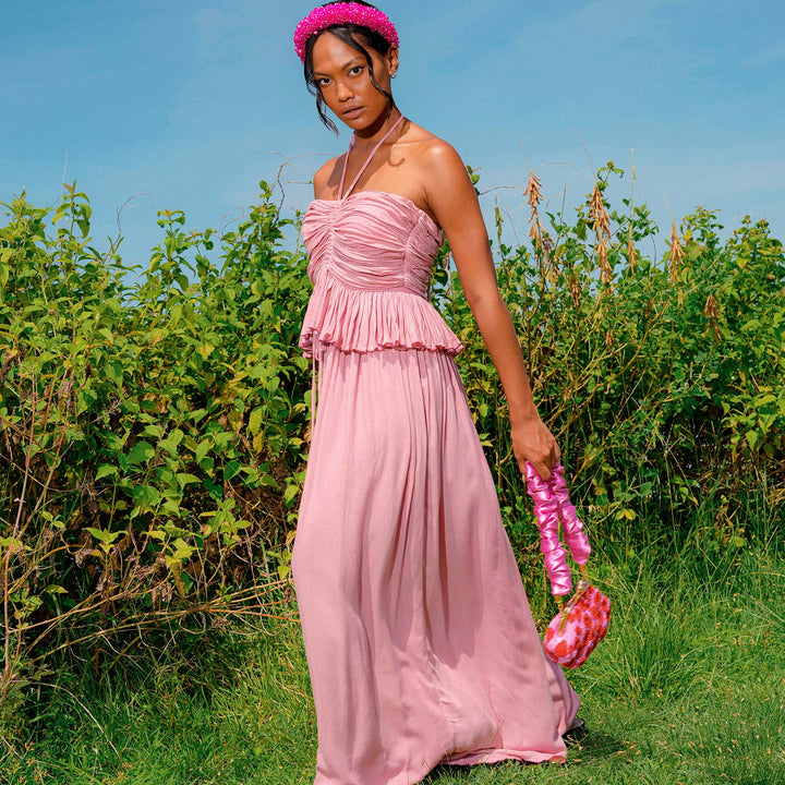 SRI is a free-spirited romantic jumpsuit piece made from light-as-air and graceful bamboo fabric for the vacation season. Featuring a high density of ruched details and a dramatic palazzo wide-leg jumpsuit style, SRI has halter straps and a feminine peplum waist that is captivating and infectious.