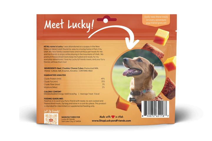 Lucky & Friends premium 100% freeze dried pet treats will excite your pet and have them always on their best behavior. Lucky's fully cooked and freeze dried beef and cheddar cheese treats are made with 100% freeze dried beef and cheddar cheese. There are no additives, fillers, water or preservatives added to these treats. As soon as you open the bag, you will see the difference- whole muscle meat, not nasty little pressed cubes, like the other guys have.