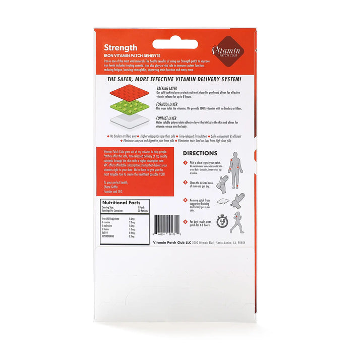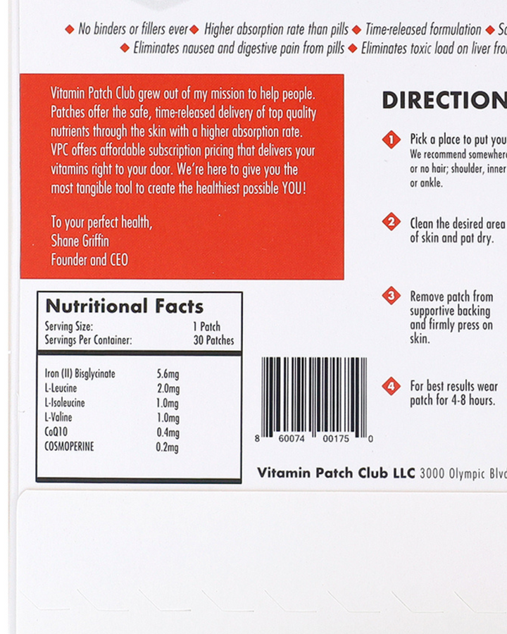 Iron is essential for healthy blood, muscles, and nerve function—fueling your body from the inside out. The Strength Patch delivers highly absorbable Iron (III) Bisglycinate directly into your system, helping maintain energy, endurance, and overall vitality.