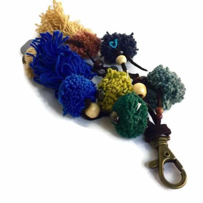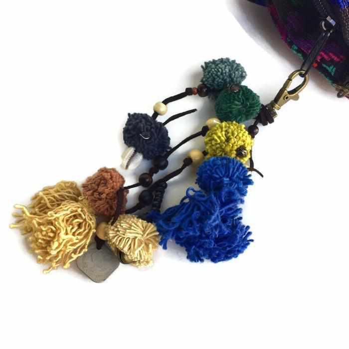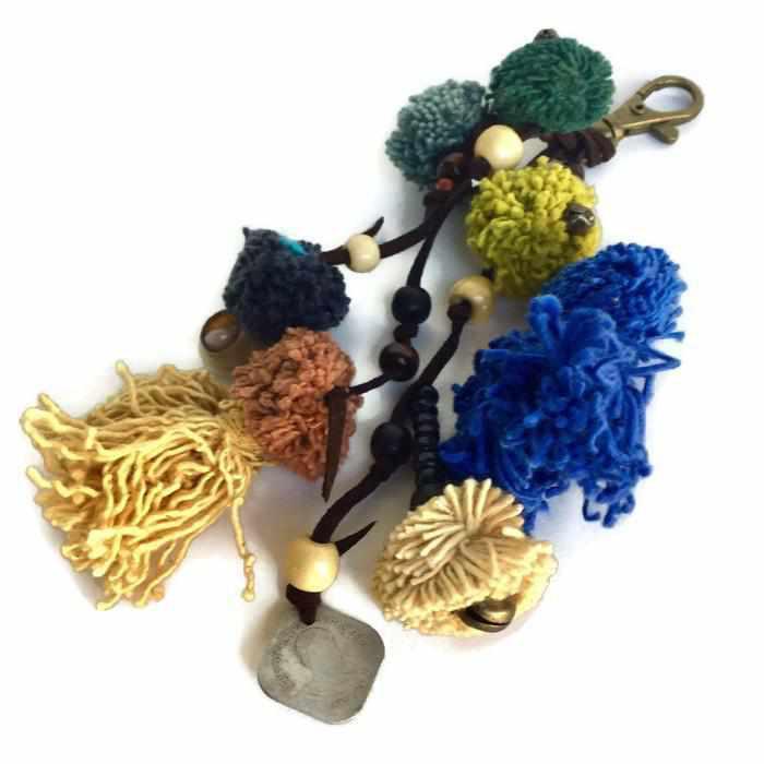 Created by women artisans from the Hmong hill tribes in Northern Thailand, each piece combines richly textured pom poms, hand-strung beads, and natural shells. The result is a vibrant charm that brings movement, meaning, and color to any bag or key ring.