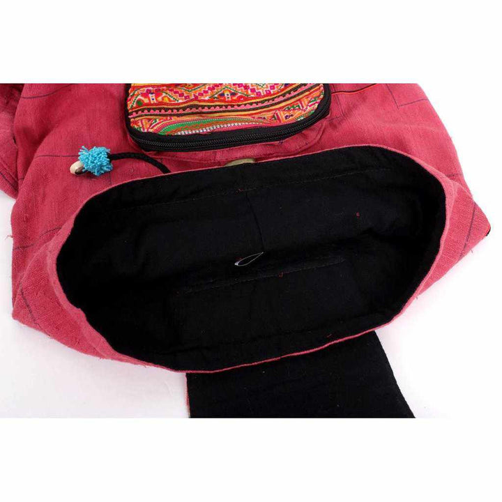 Fan favorite, this limited edition backpack is a true work of art. Using upcycled pieces of Hmong fabric, bright pink canvas is expertly combined by our artisan partners to create this piece. Finished with a black pull string chord and pompoms.